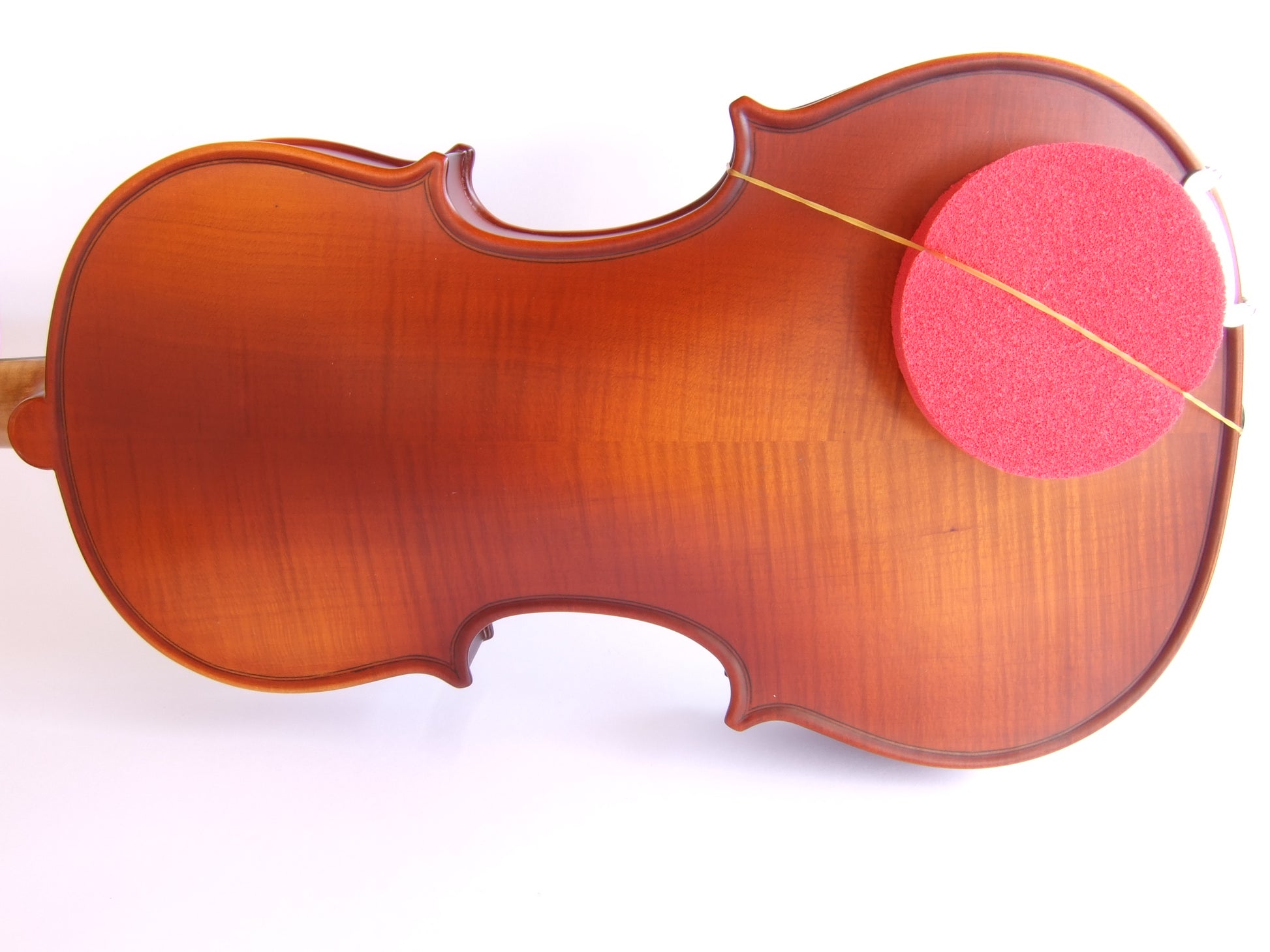 Fitting on to instrument is as easy as stretching a rubber band from the corner of the rib (“C” bout to the back of the instrument - end button) and the slipping sponge under rubber band.