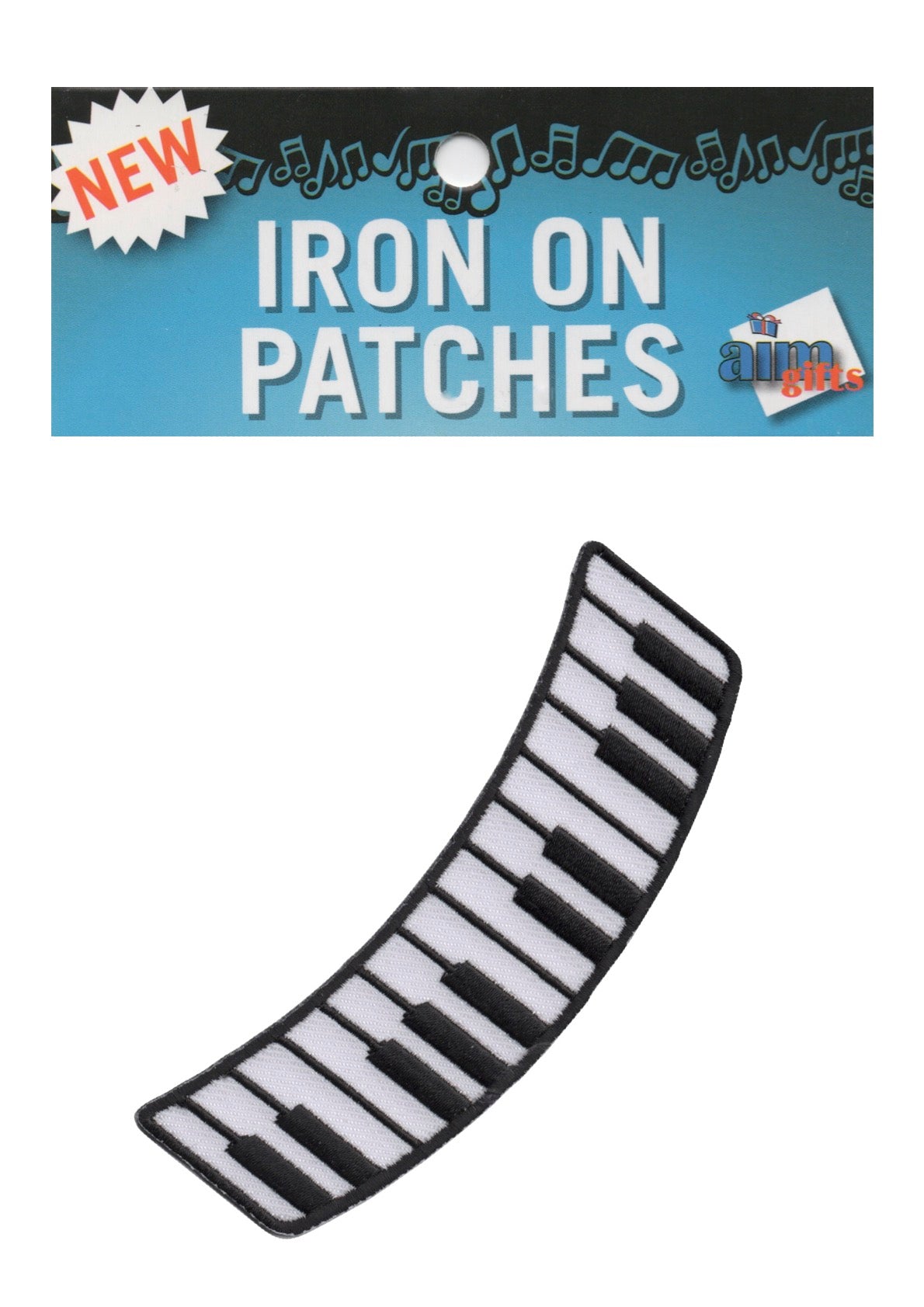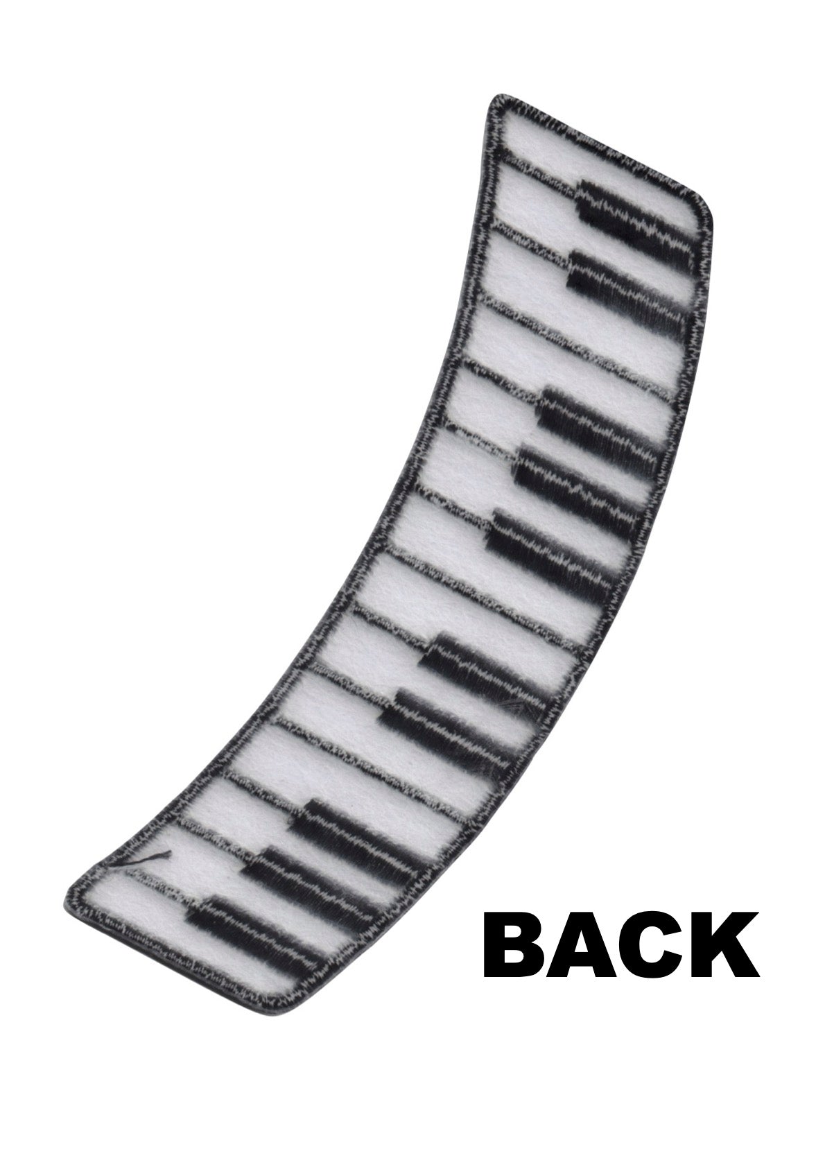 AIM Gifts brand curved black and white embroidered music piano keyboard iron on patch.