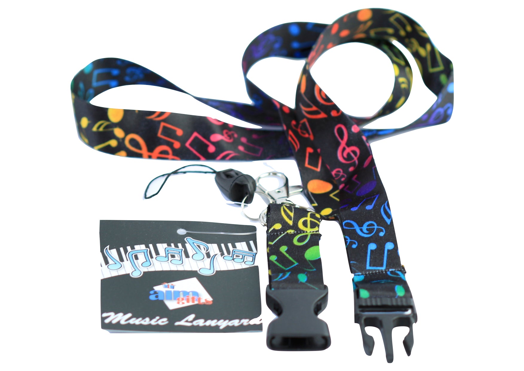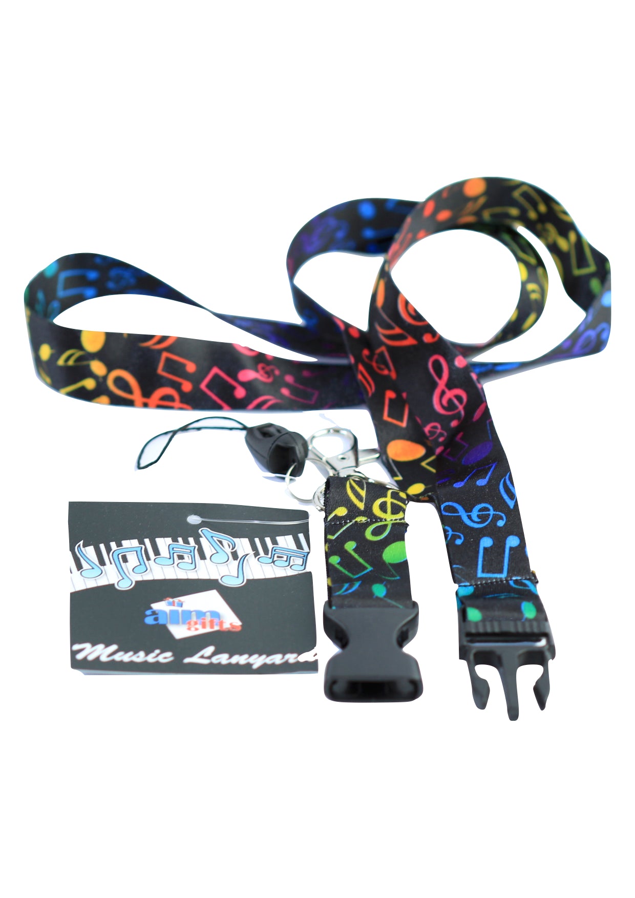 AIM Gifts brand lanyard with multi coloured music notes design.