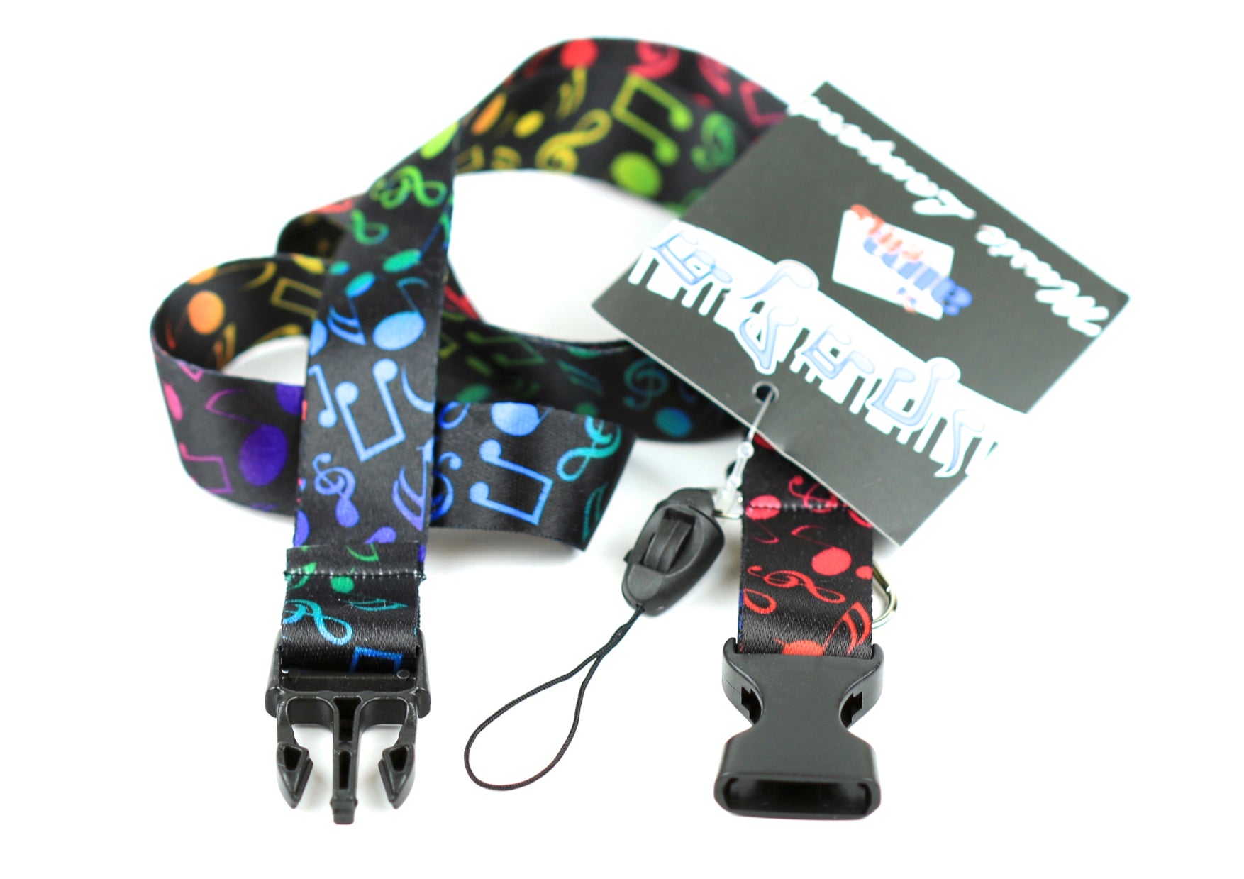 Plastic release buckle and metal clip to hold ID cards etc Mobile phone tie with releasable/detachable plastic buckle Music notes print on both sides of lanyard.