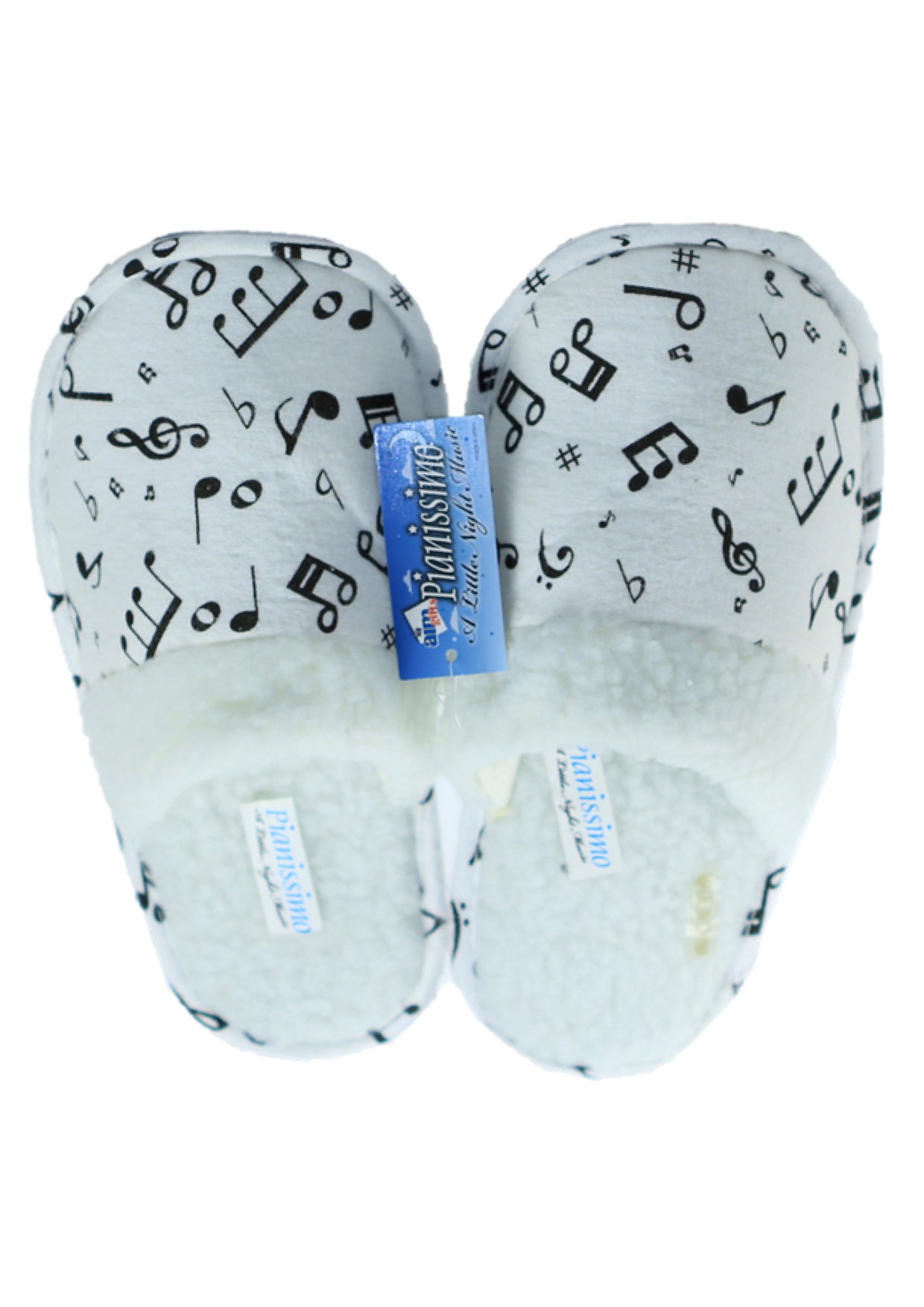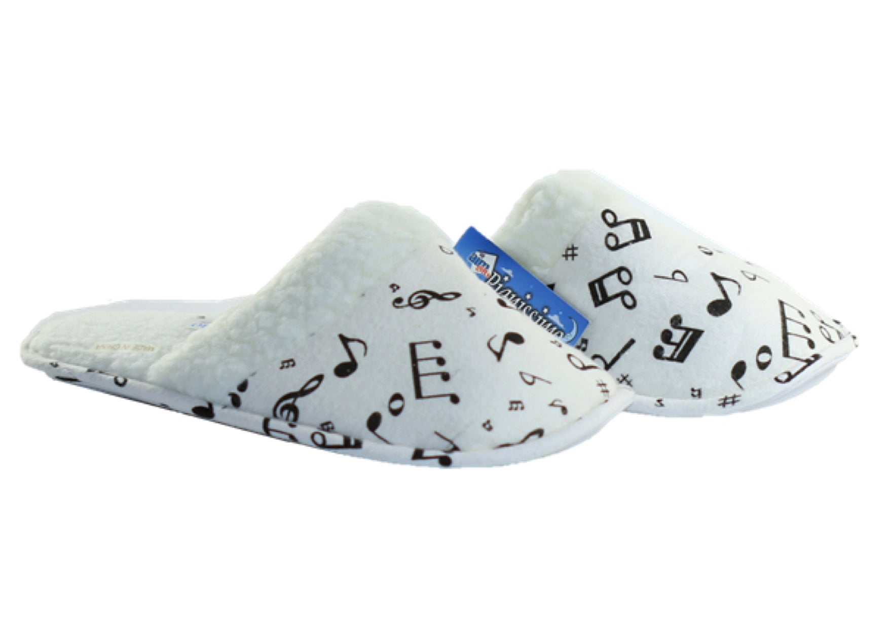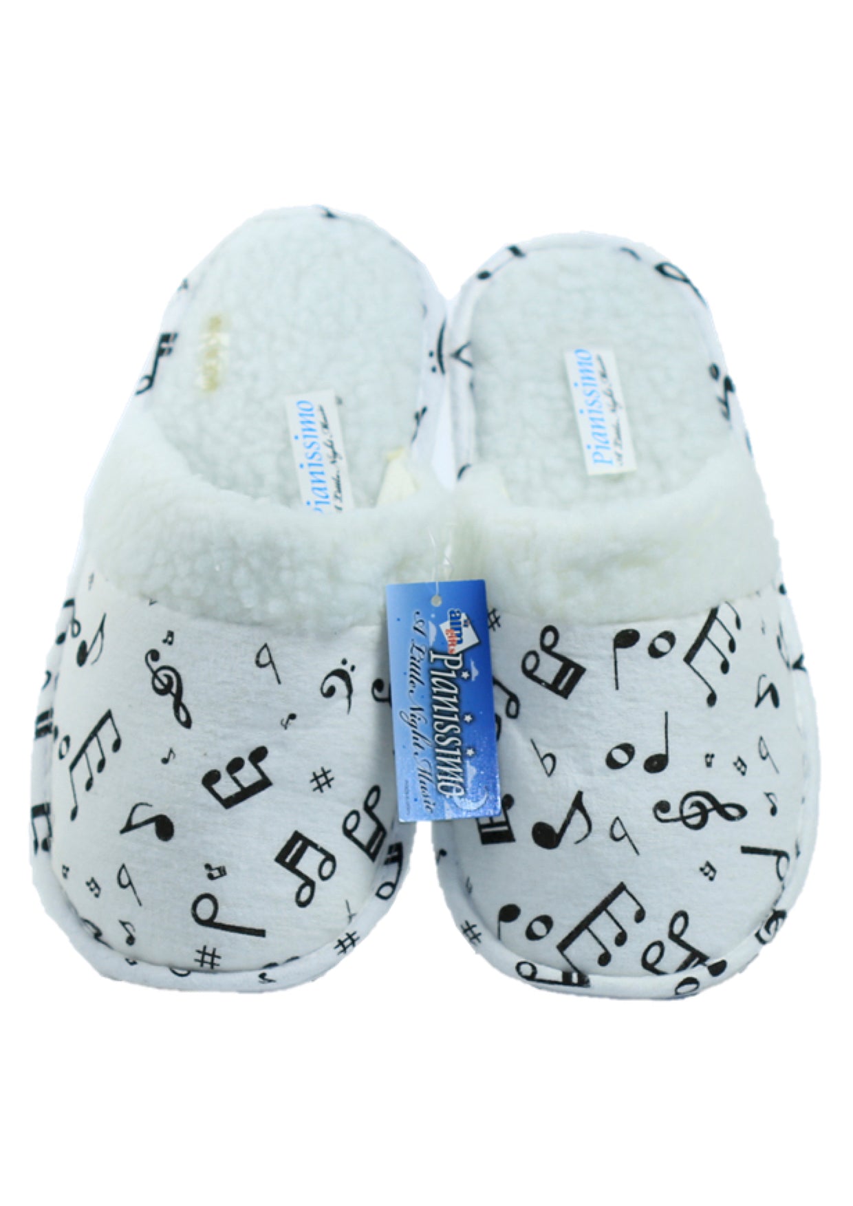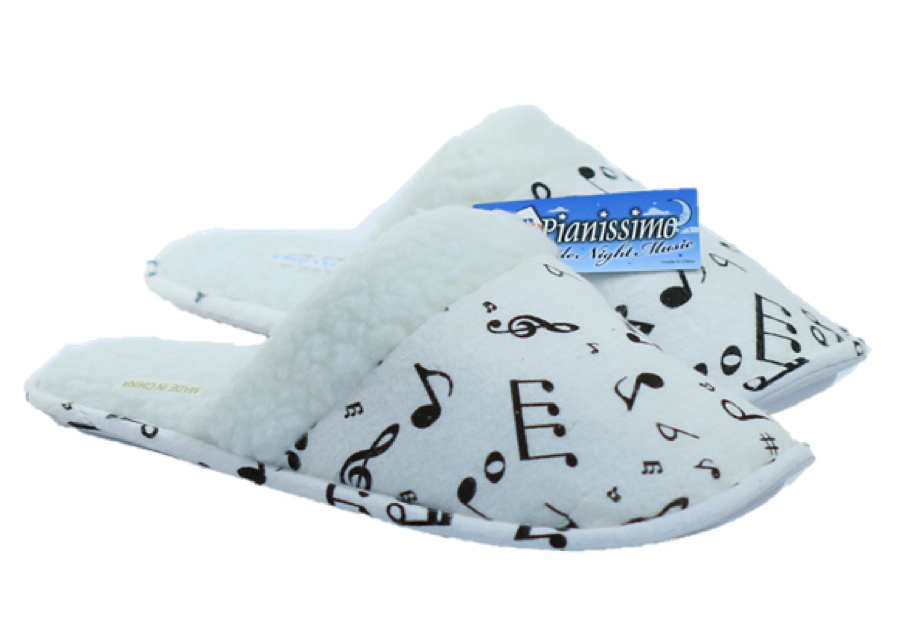 Quality AIM Gifts brand music themed novelty slippers. Scuff slippers Round toe Slip on Synthetic wool blend/flannel (Upper and inner sole) Non slipp rubber outer sole Made from super snugly synthetic wool blend and flannel, these slippers are designed for ultimate comfort. Durable non slip rubber soles.