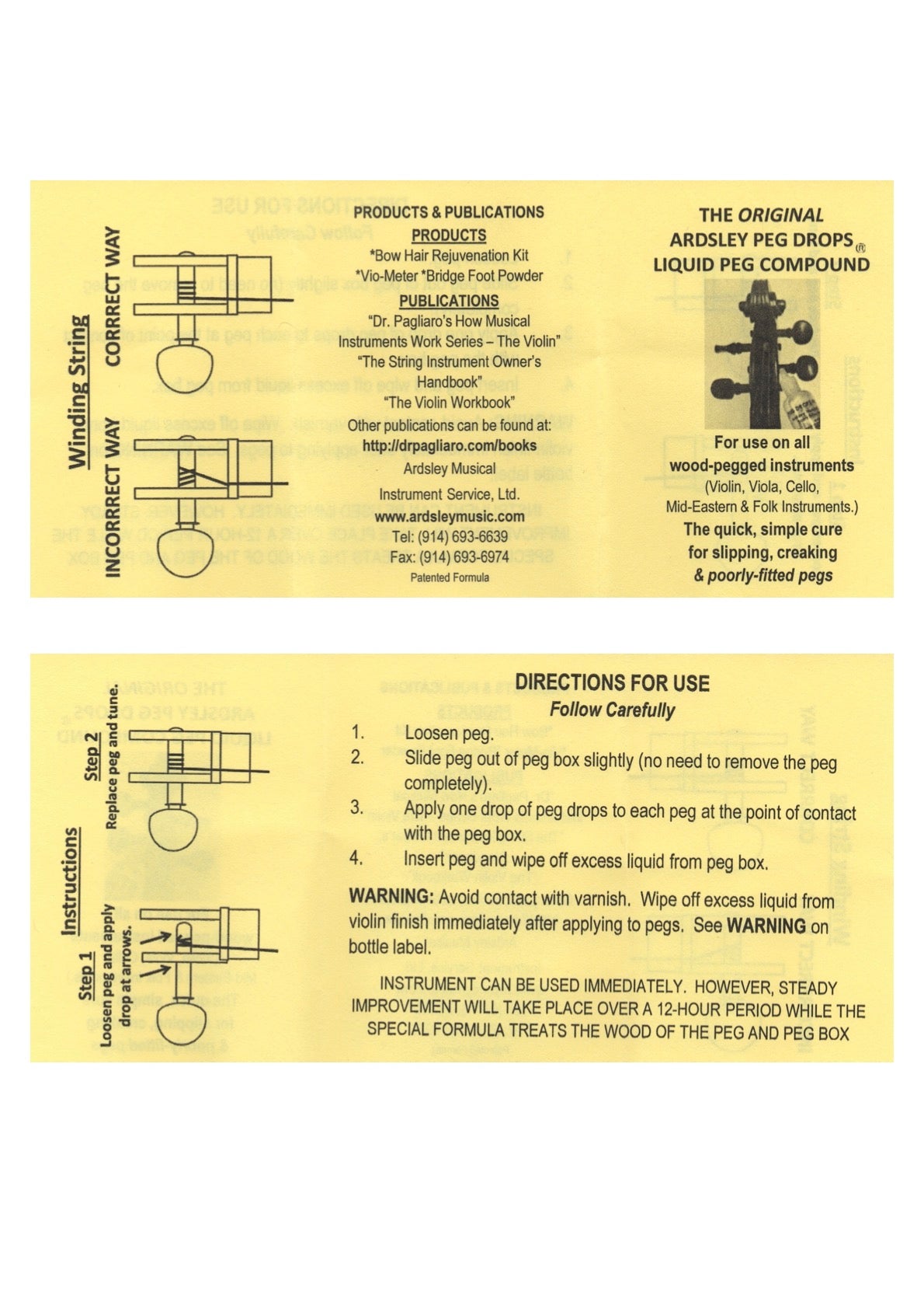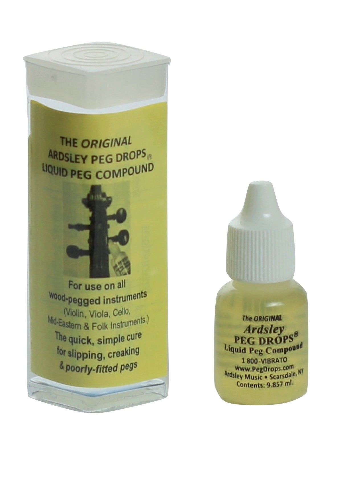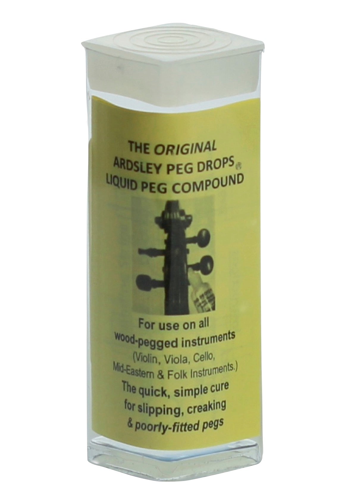 The Ardsley peg drops cures squeaky and slipping pegs. Easy application without the need to remove peg from peg box. Simply loosen peg and slightly slide peg out of peg box. Apply one drop of Ardley’s peg liquid at the point of contact inside the peg box. Insert peg back and wipe off excess liquid. Instrument may then be used immediately but allow up to 12 hours for the special formula to treat the peg and peg hole. Contents: Plastic bottle 9.857ml.