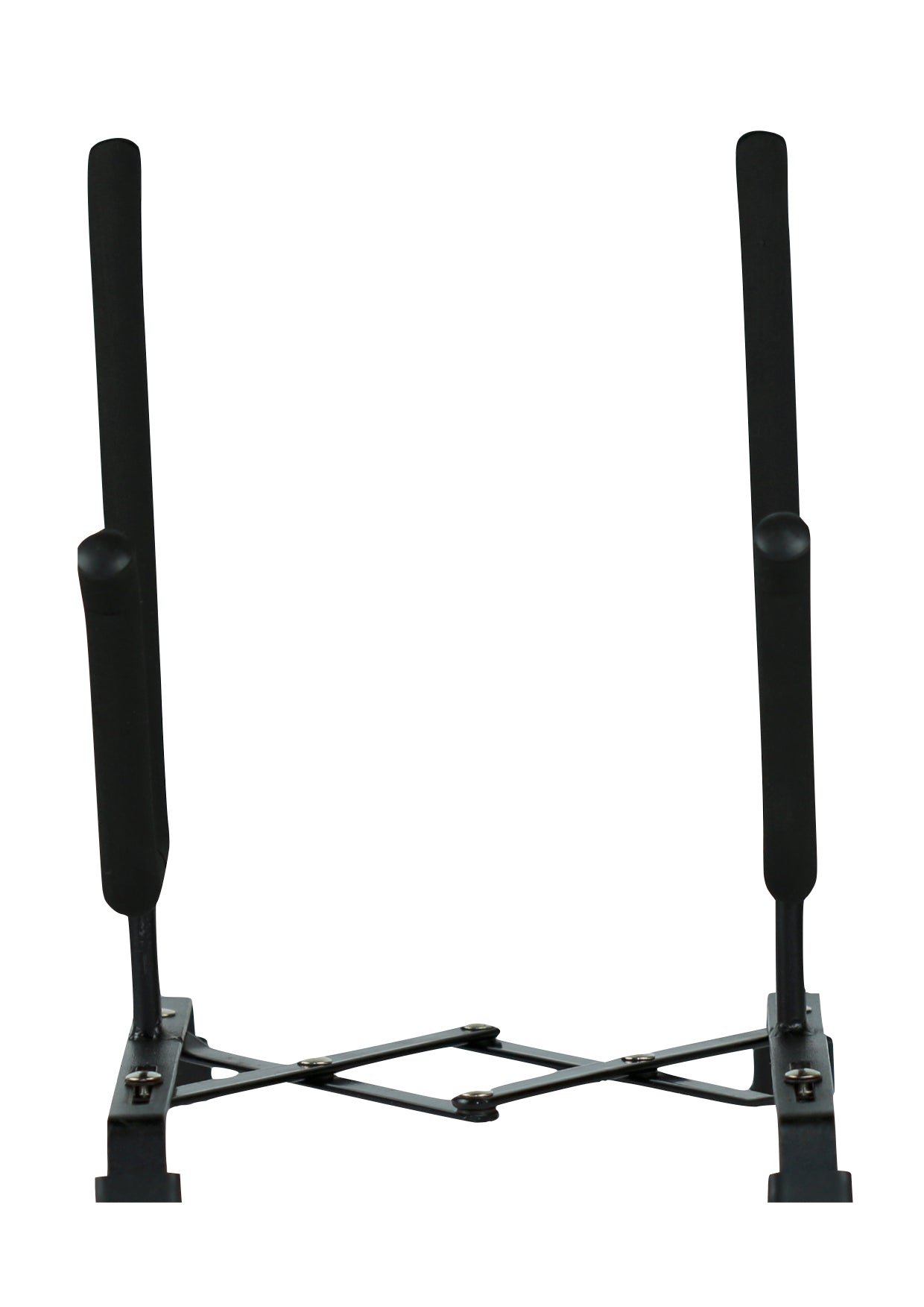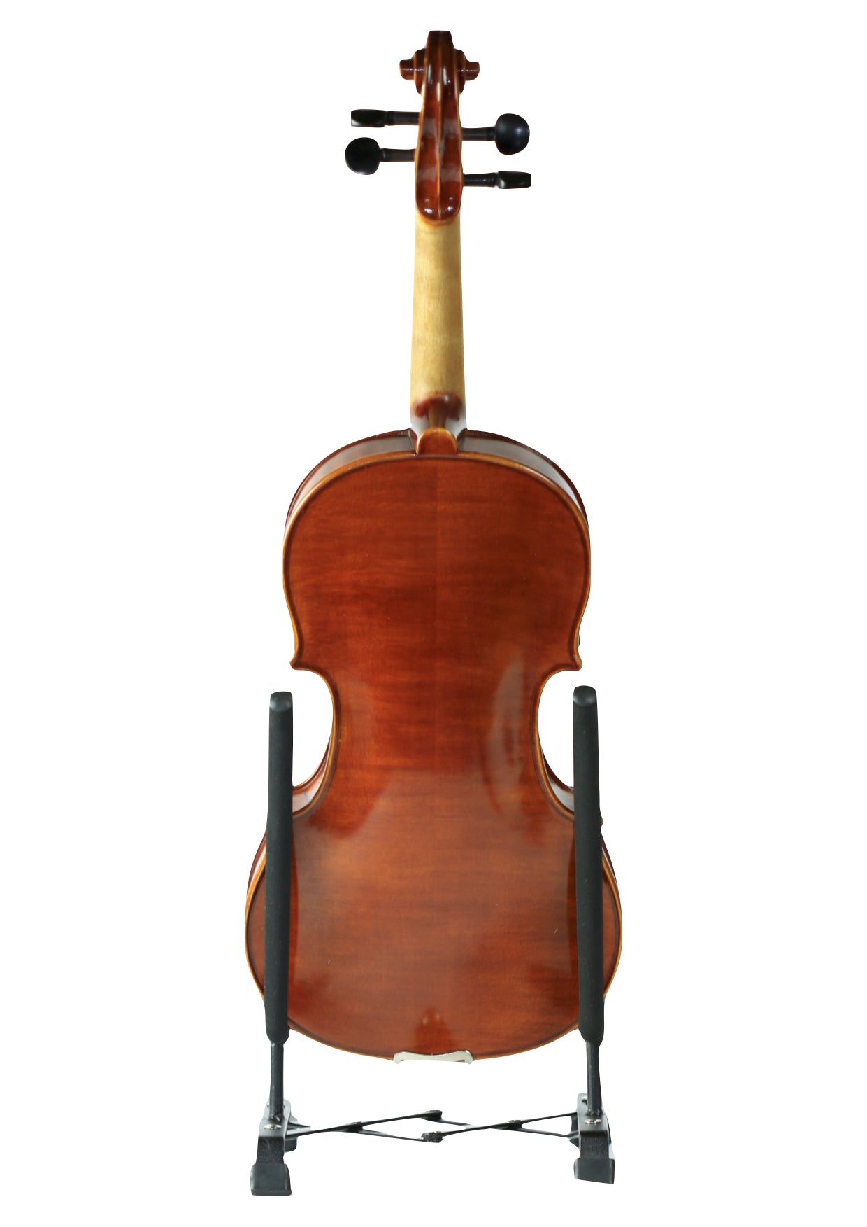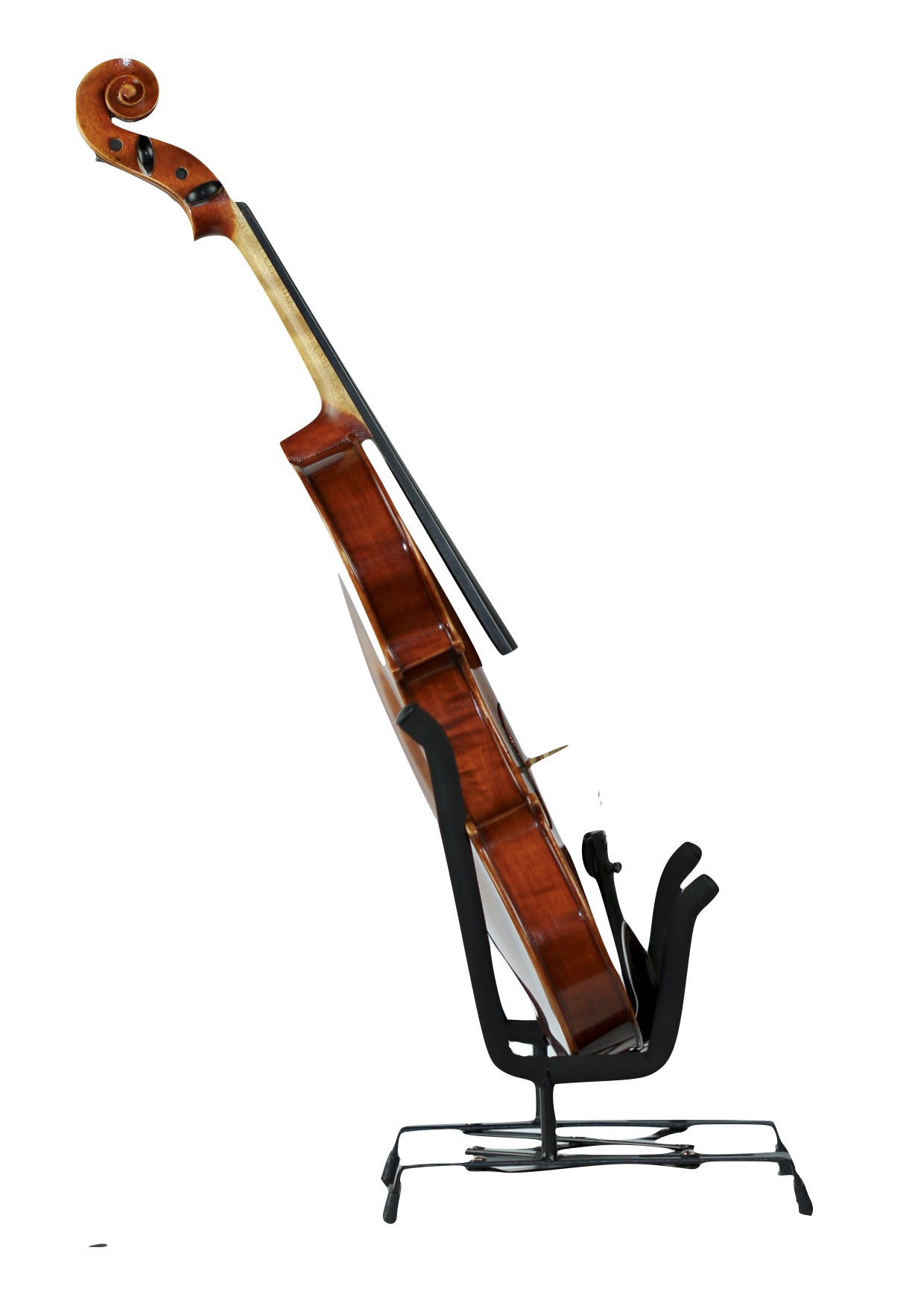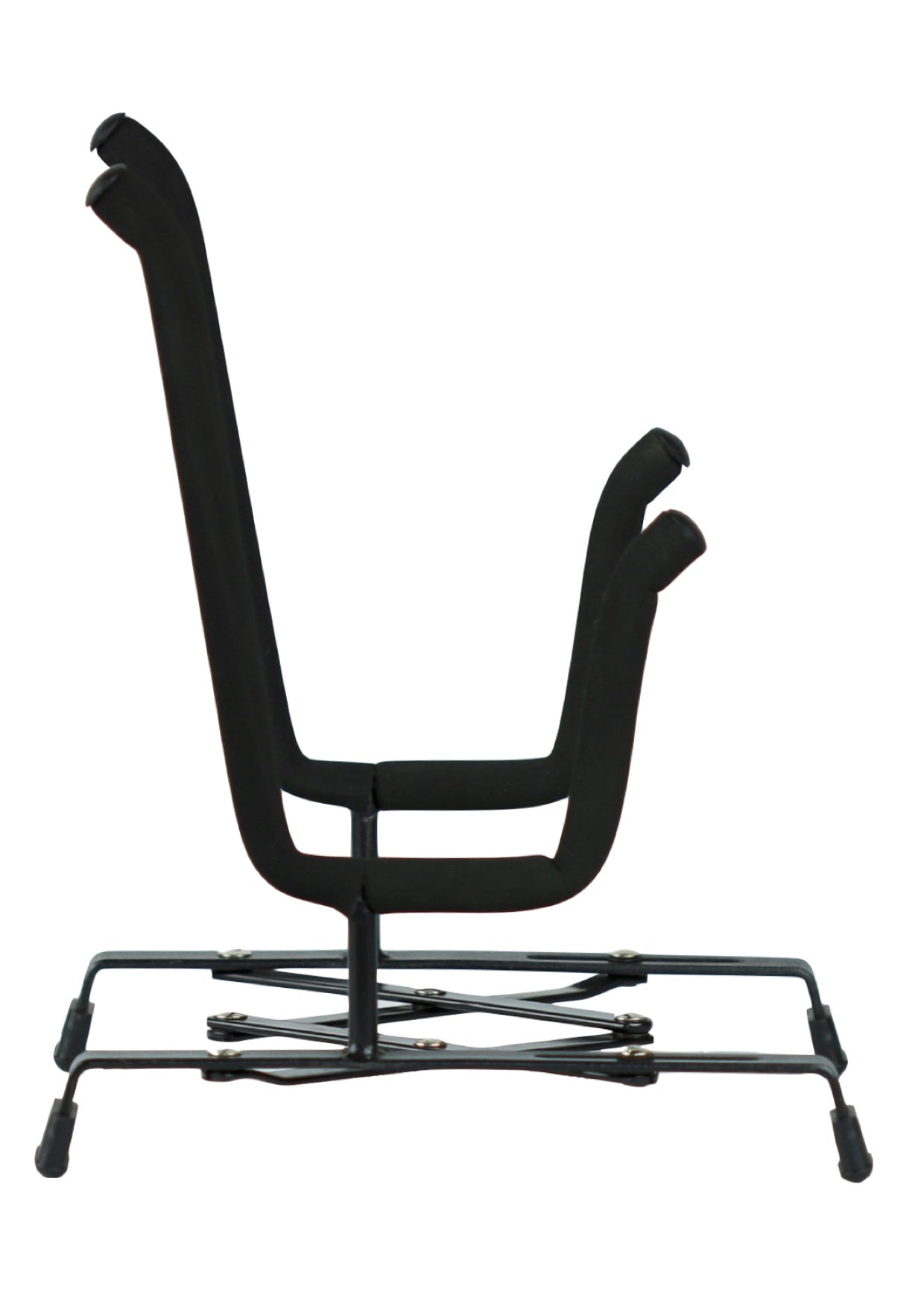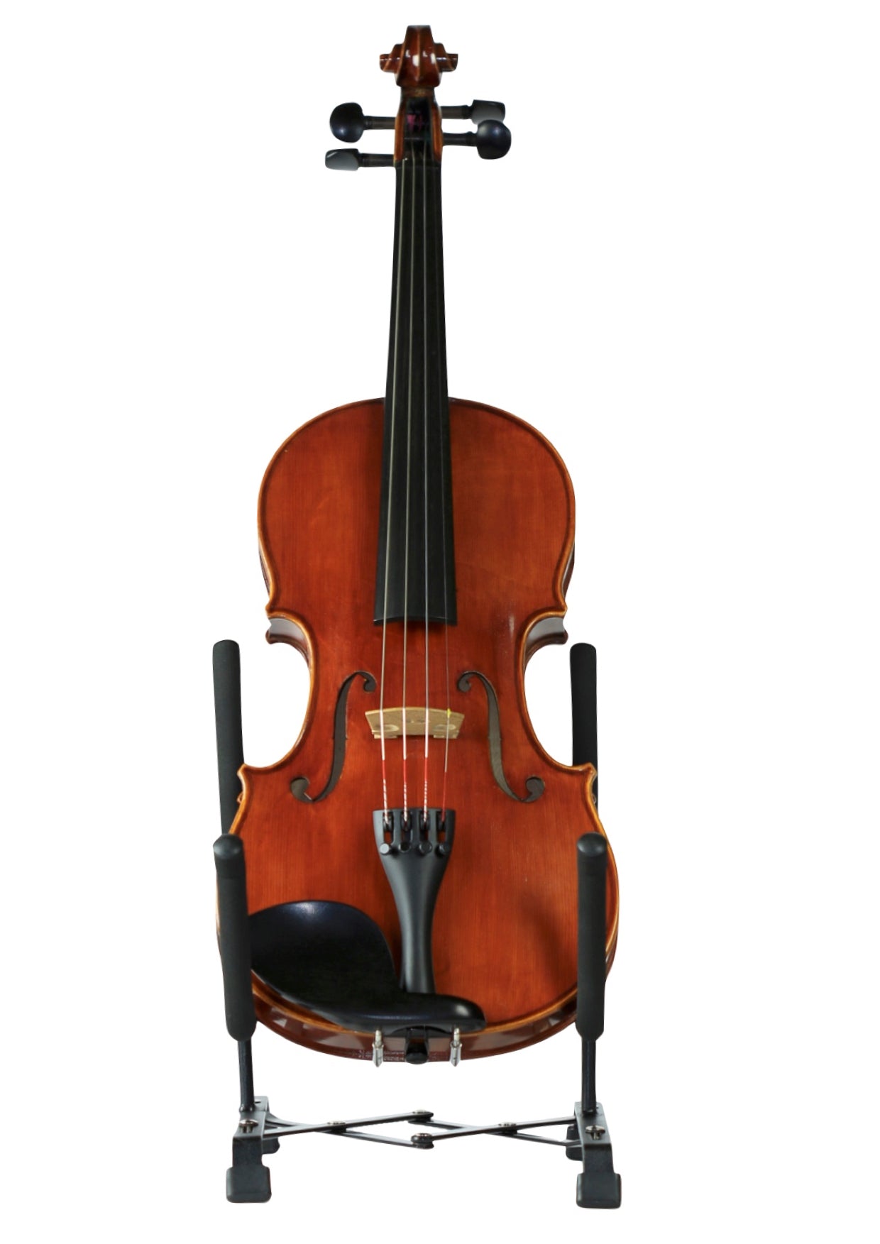 Black metal violin/viola display stand that expands to fit all instrument sizes.