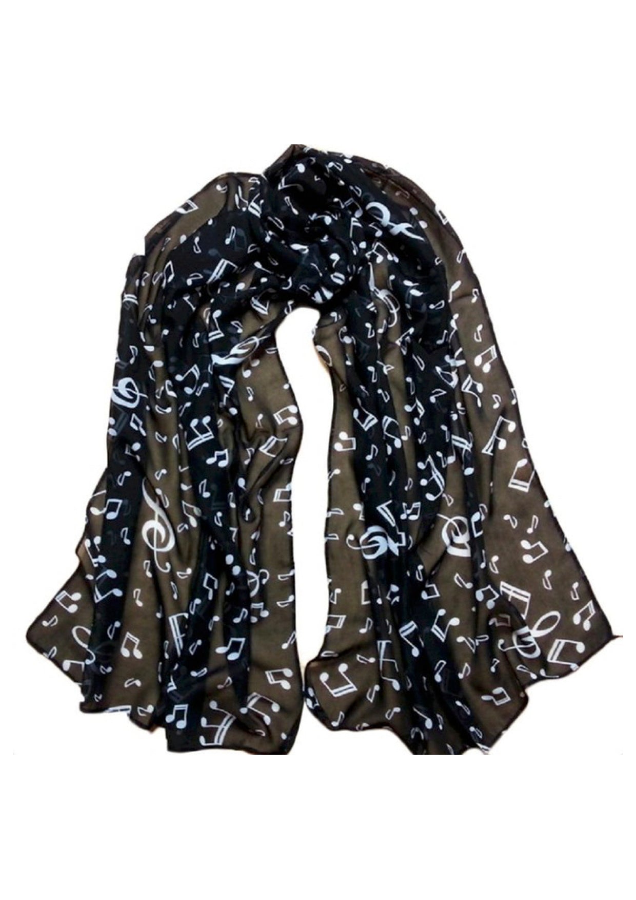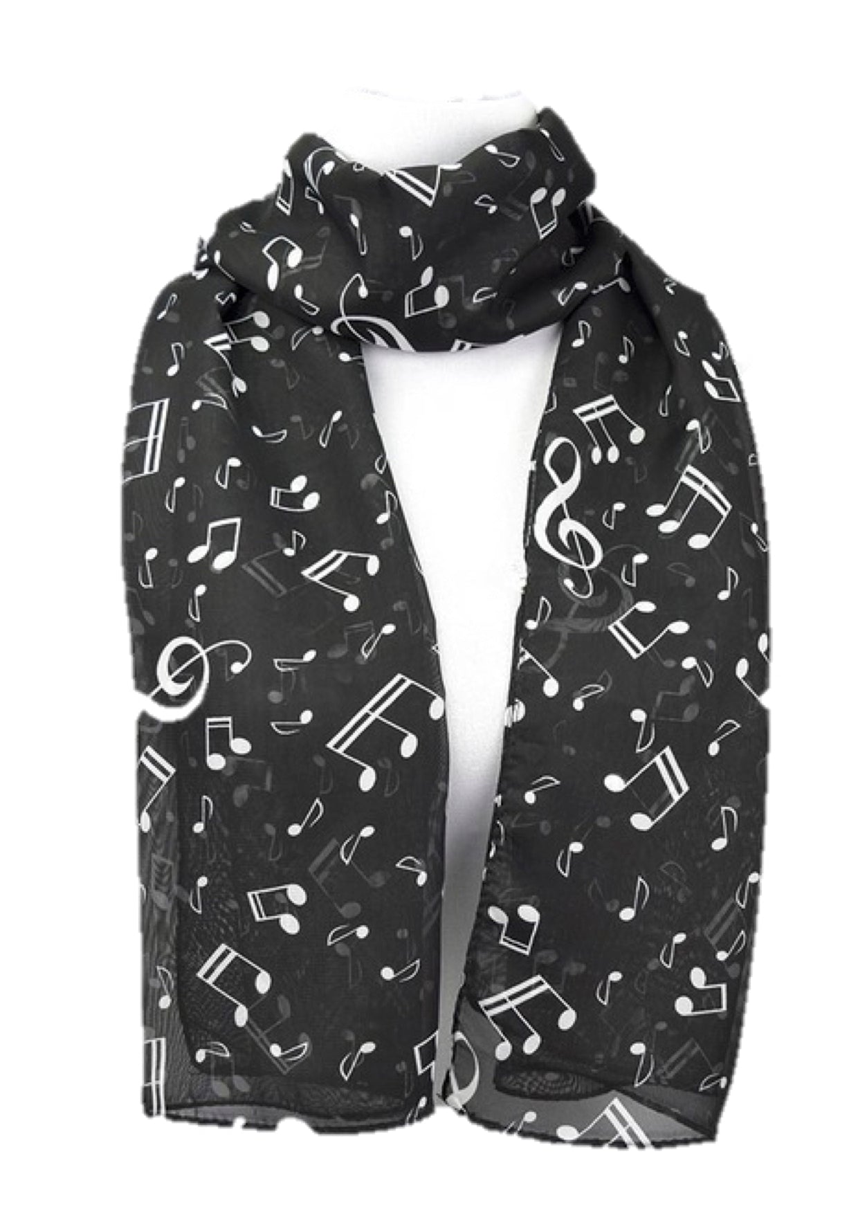 Black musical symbols quality chiffon neck scarf shawl. Long rectangular size 47cm X 156cm (Approximately due to the stretching nature of this fabric) Makes a great gift idea for musicians, music teachers and students. Neatly packaged in resealable plastic bag.