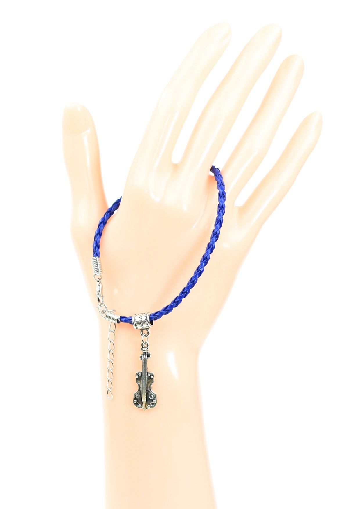 Dark blue braided leather bracelet with violin charm lobster claw clasp & chain extension Quality dark blue braided leather bracelet with violin charm lobster claw clasp & chain extension Approximate length of leather band with clasp is 20cm Approximate overall length of leather band with chain extension is 26cm Violin Charm Length: 3cm Charm Material: Zinc Alloy