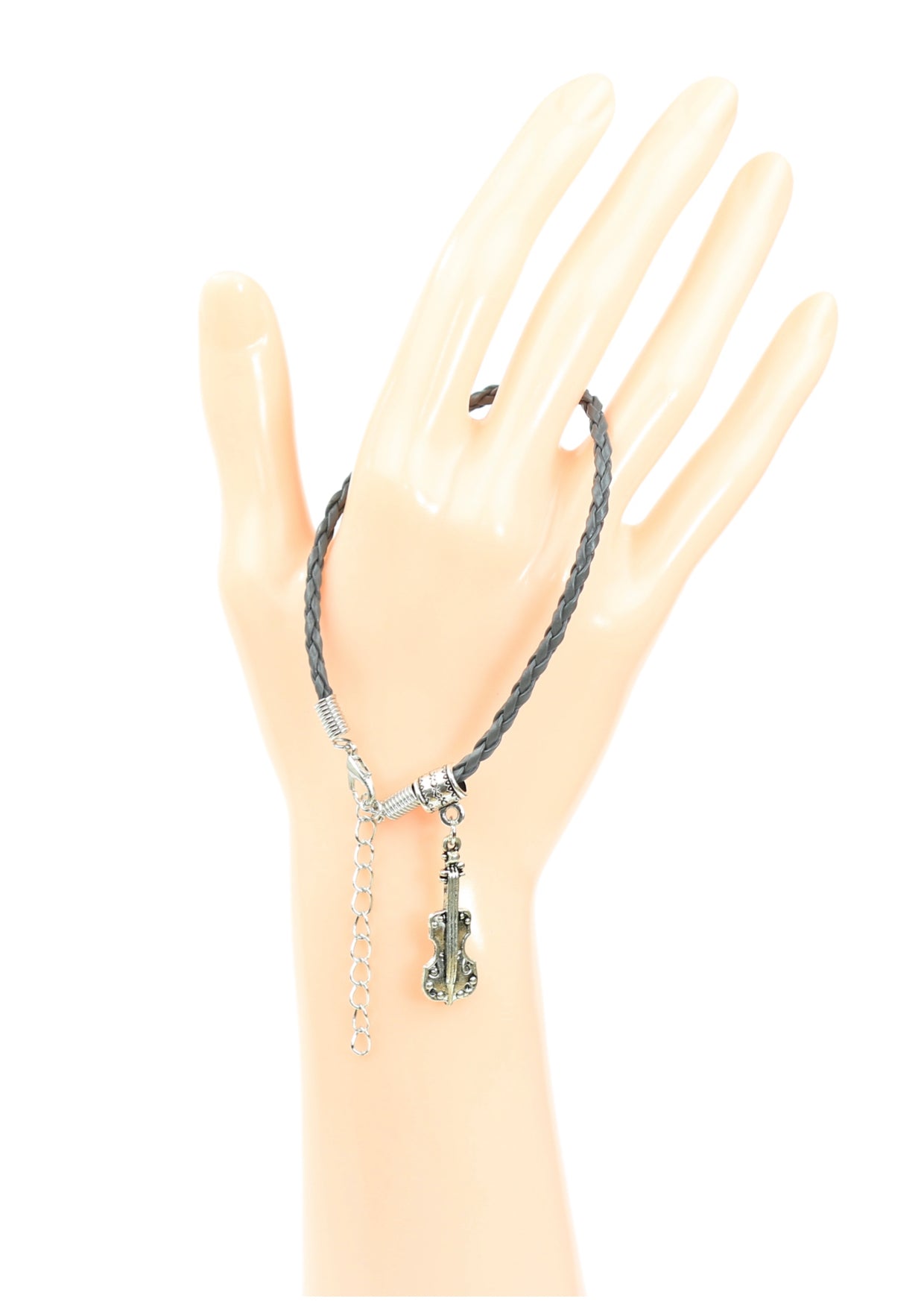 Grey braided leather bracelet with violin charm lobster claw clasp & chain extension Quality grey braided leather bracelet with violin charm lobster claw clasp & chain extension Approximate length of leather band with clasp is 20cm Approximate overall length of leather band with chain extension is 26cm Violin charm Length length: 3cm Charm material: Zinc Alloy