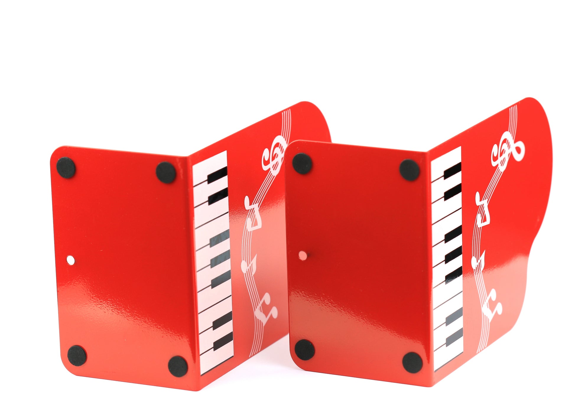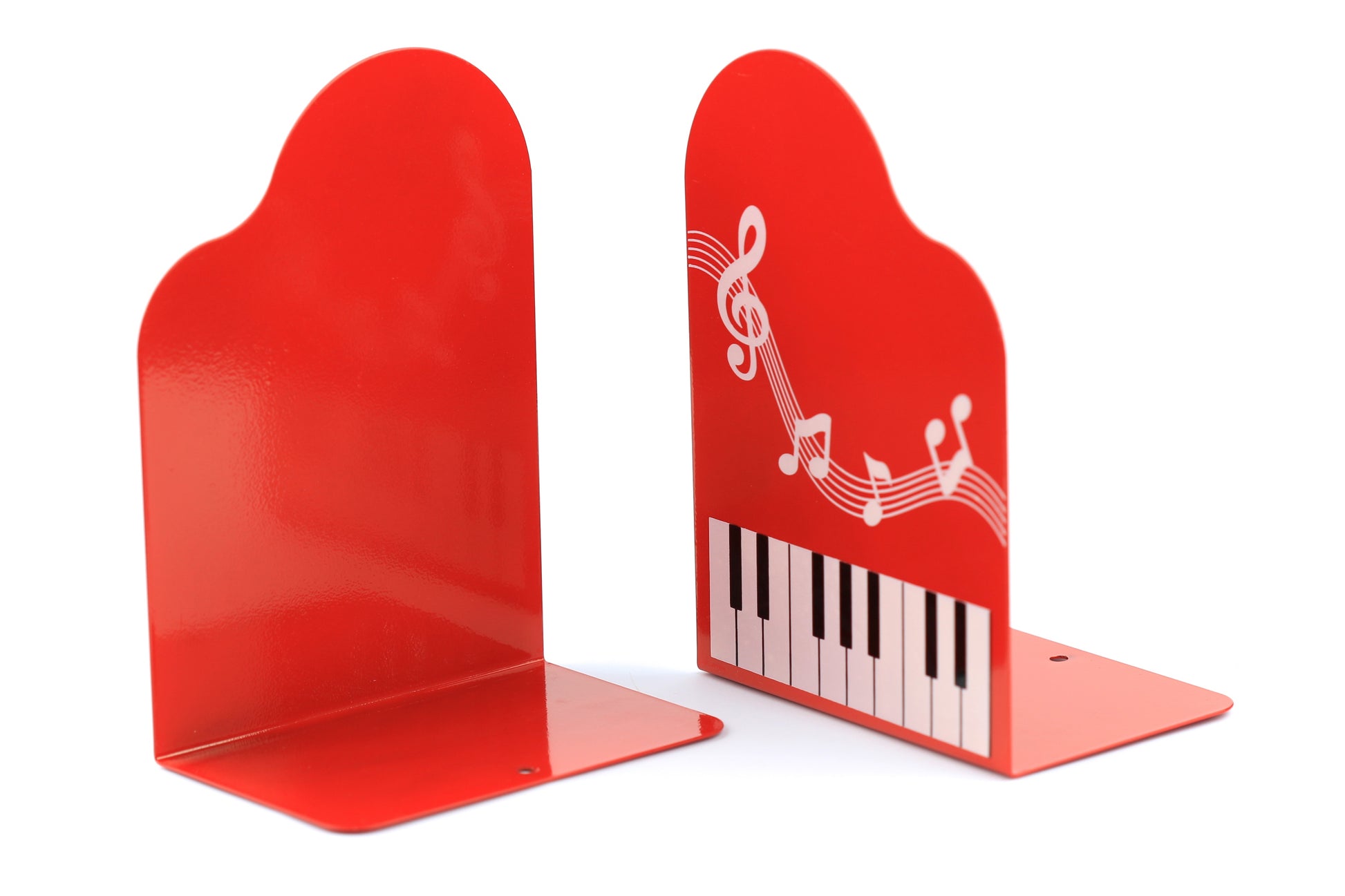 Heavy duty red metal music notation piano keyboard design bookends. Beautifully designed grand piano shaped bookends with musical notation and a piano keyboard design printed on the outside of both bookends.