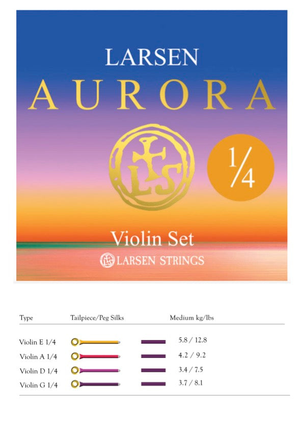 Larsen Aurora violin strings are suitable to players of all ages, from the youngest beginner student to the seasoned player looking for a new, higher quality, reference standard for violin strings.