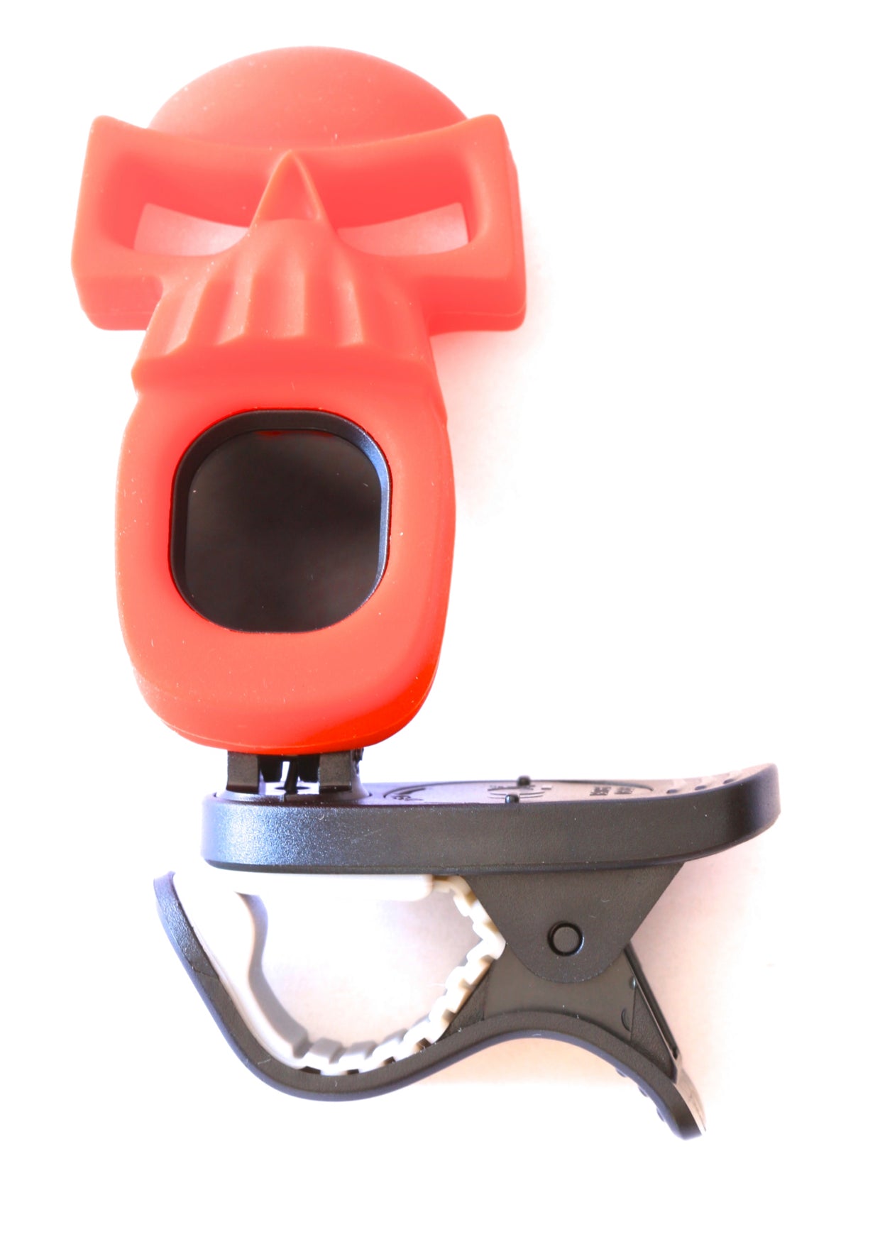 B73 swiff brand red skull clamp on chromatic tuner 5 instrument tuning modes A fun, simple and accurate way to introduce young children to tuning their instruments. Simply clip tuner on to your instrument, as tuner operates using instruments vibrations and not via a microphone. Press the power button and hold to turn on unit. Similarly, holding button down again switches unit off. By pressing power button again you can scroll through the different tuning modes. The 5 tuning modes are: - Chromatic Tuner - Guitar Tuner - Bass Tuner - Ukelele Tuner - Violin Tuner The Tuner turns off automatically after 5 minutes if idle. B73 Model SPECIFICATIONS Tuning Modes: Chromatic, Guitar, Bass, Ukelele and Violin Tuning Method: Clip on Vibrations Precision: +/- 1 cent Calibration: A4 = 440Hz Tuning Range: A0(27.5Hz) - C8(4186Hz) Response Time: <20ms Power: 3V, Coin Cell Battery (CR2032) X 1 Included Weight: 36g Operation Manual Card Included