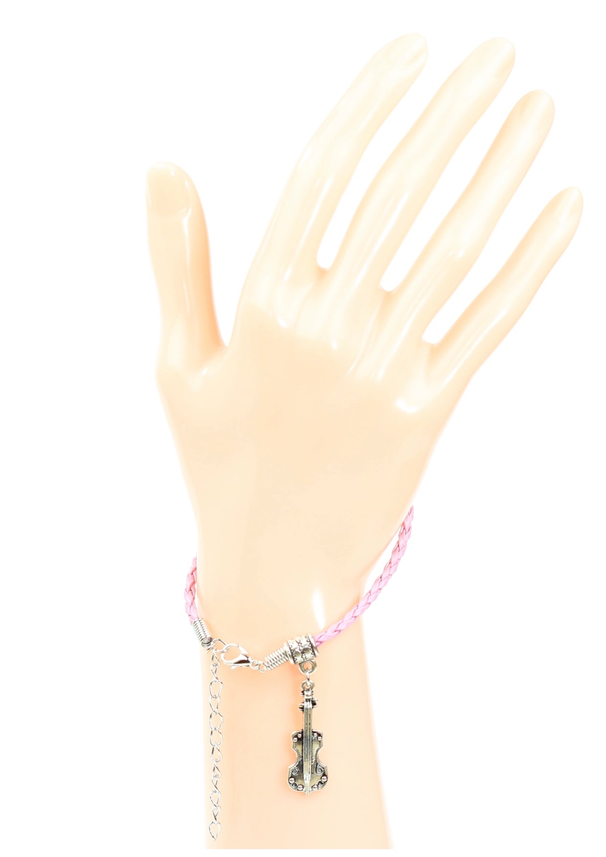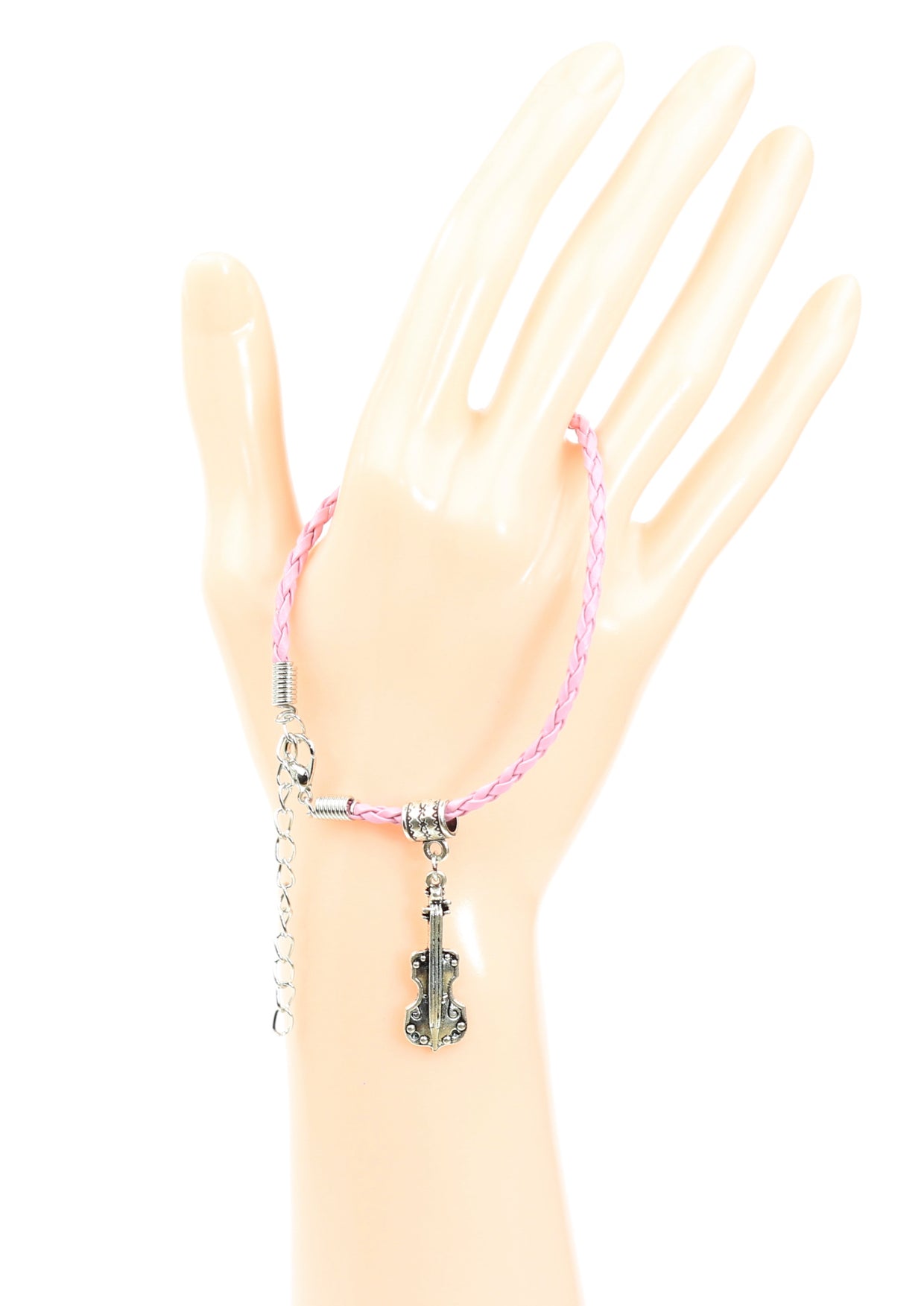 Pink braided leather bracelet with violin charm lobster claw clasp & chain extension Quality pink braided leather bracelet with violin charm lobster claw clasp & chain extension Approximate length of leather band with clasp is 20cm Approximate overall length of leather band with chain extension is 26cm Violin Charm Length: 3cm Charm Material: Zinc Alloy