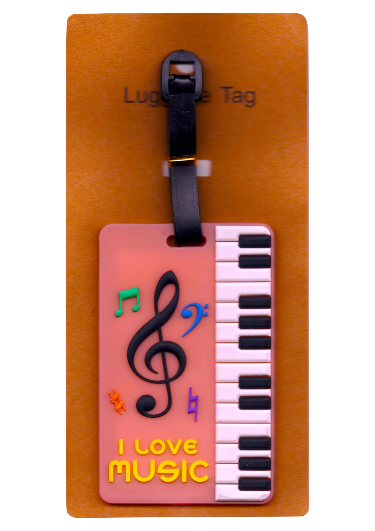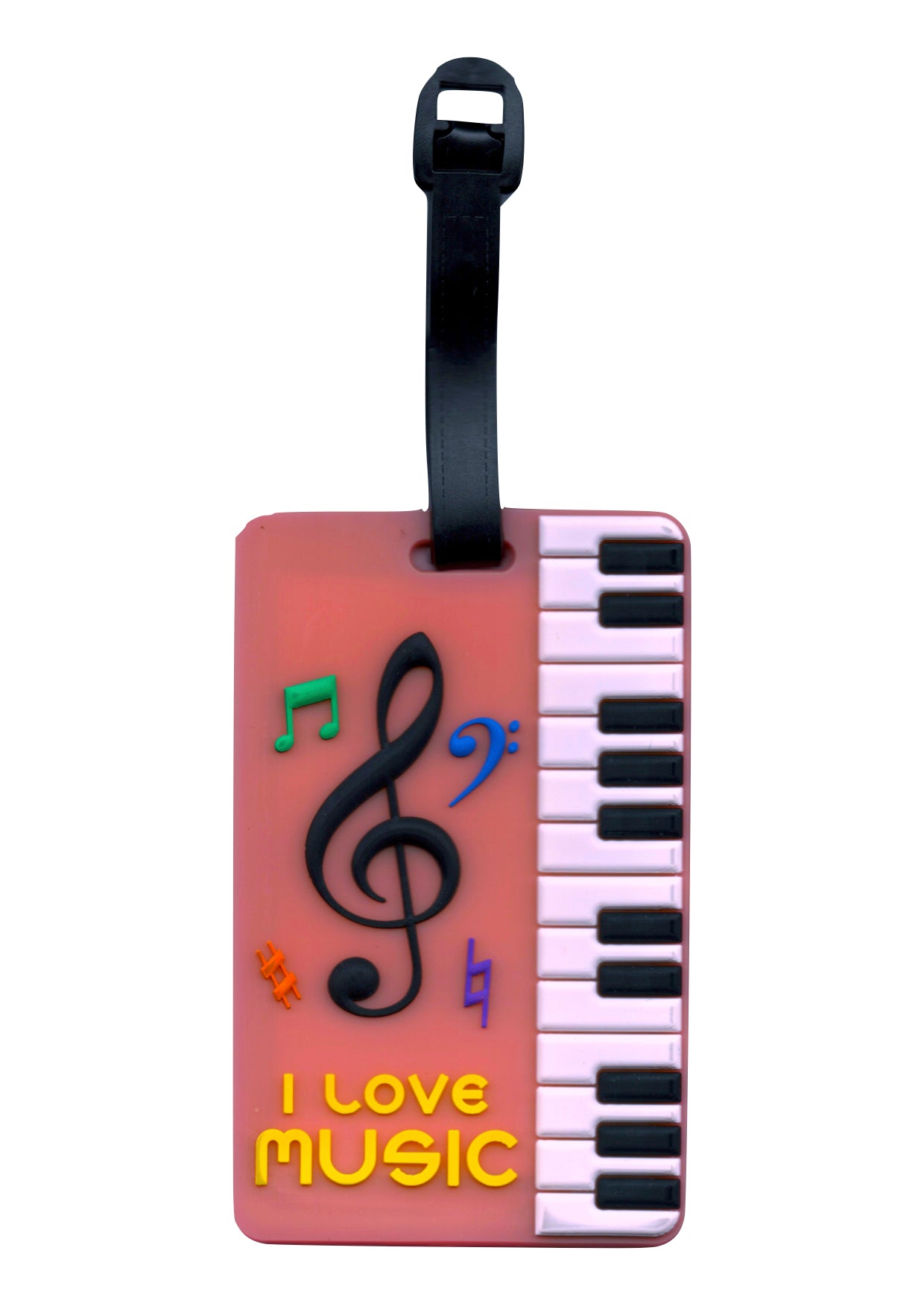 *NEW* Pink keyboard & music symbols design bag/instrument case/luggage tag. Made of PVC plastic and rubber compound with a piano keyboard and musical symbols design on one side and clear plastic window on opposite side to display personal information. 3 Pre printed information fields: