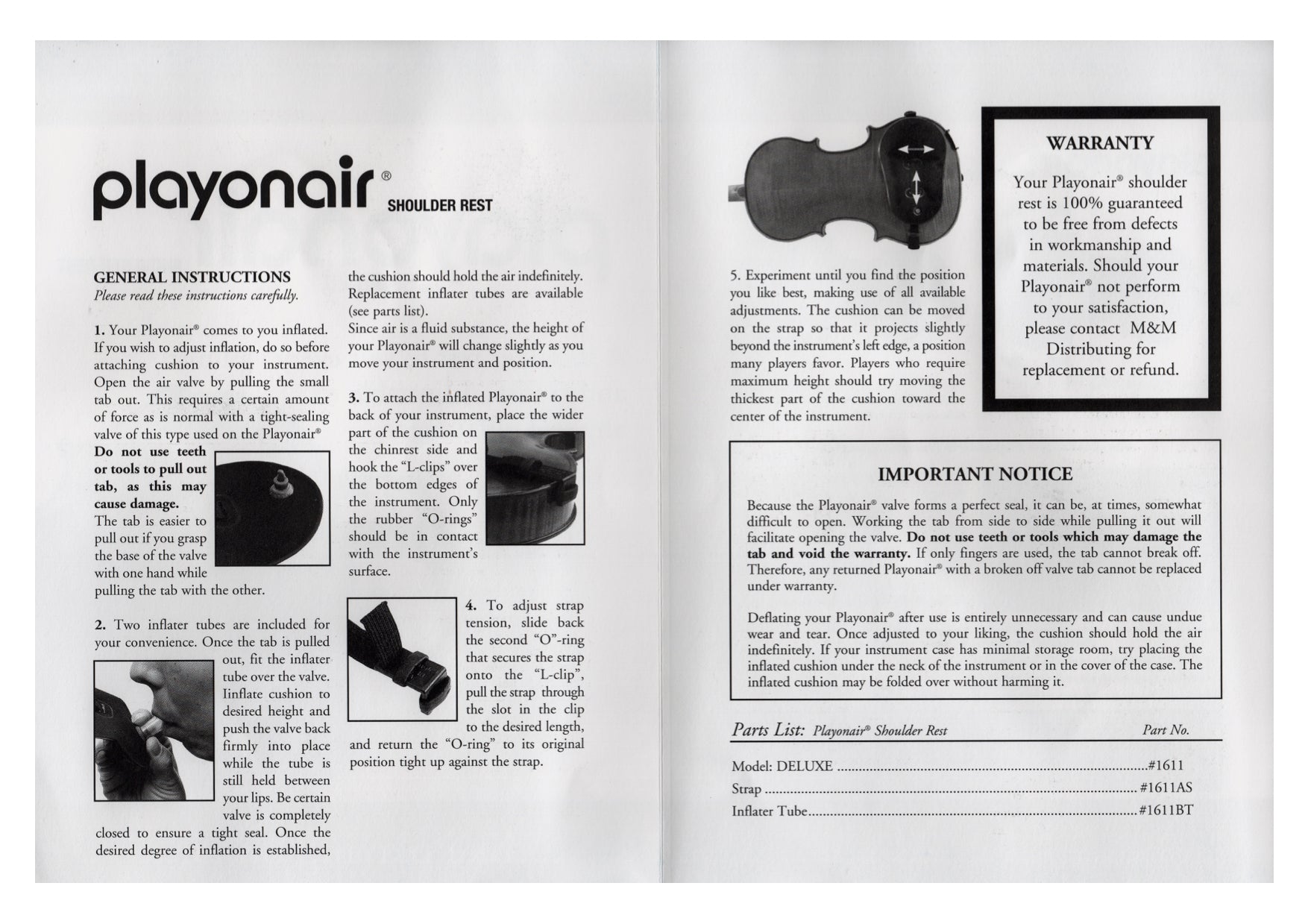 Amount of air in shoulder rest can be varied from the air tight valve on bottom of rest. (2 rubber tube blowers included)