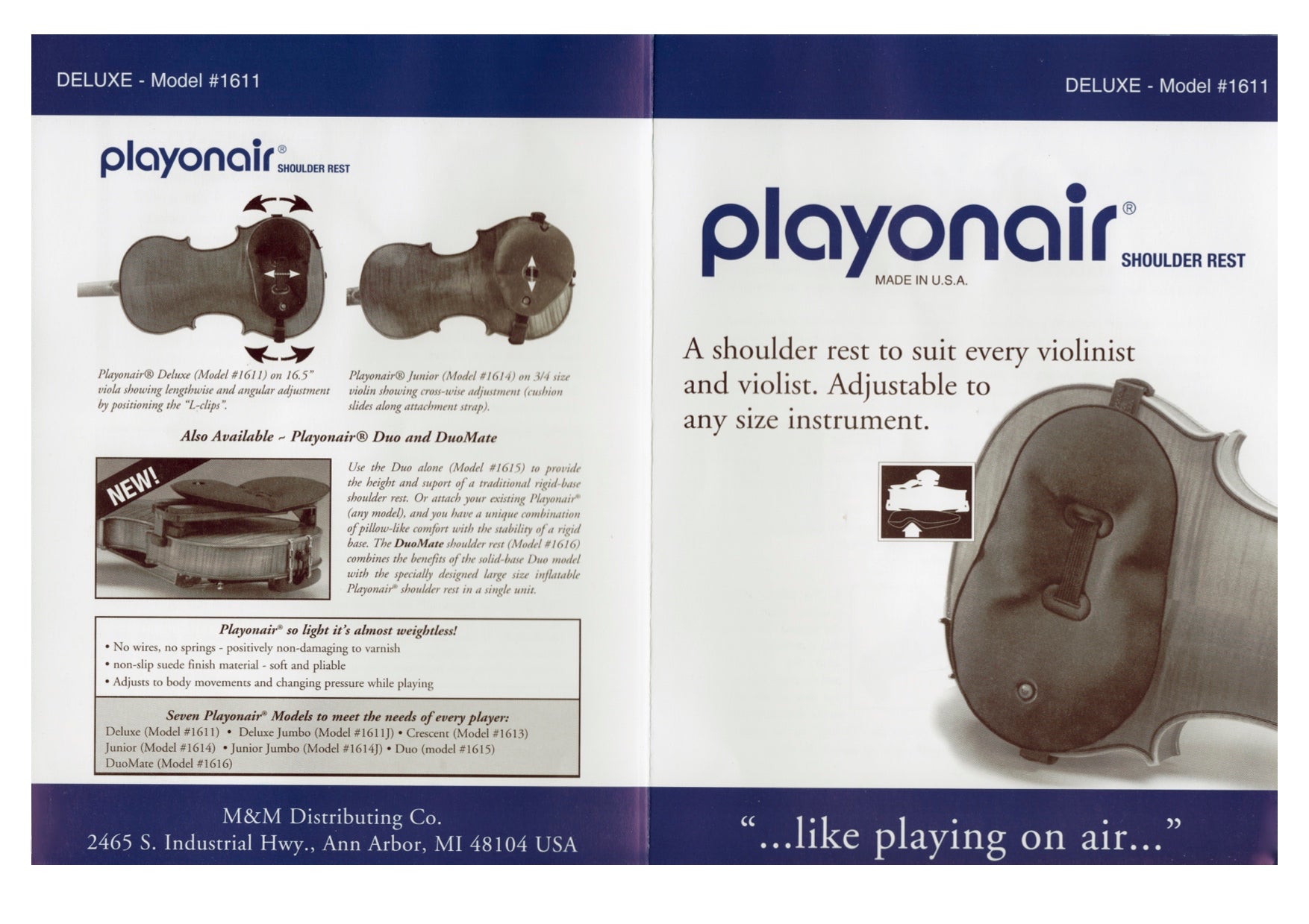 Playonair violin viola shoulder rest deluxe Model #1611 fits all sizes