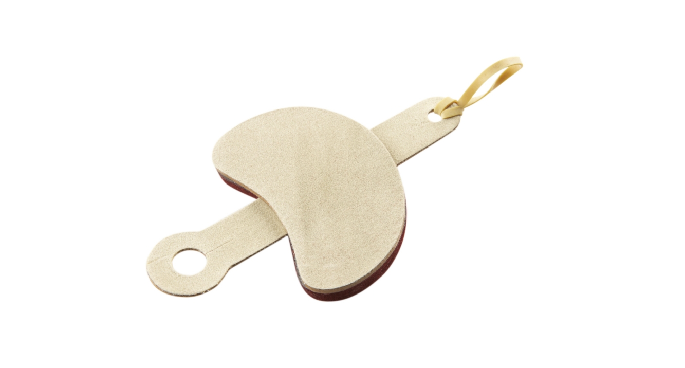 The Kidney shaped velour pad is mounted onto a leather strap which from one end is fatened onto the violin button/stud and held in place from the opposite end via a rubber band which secures itself on the corner of the violin rib.