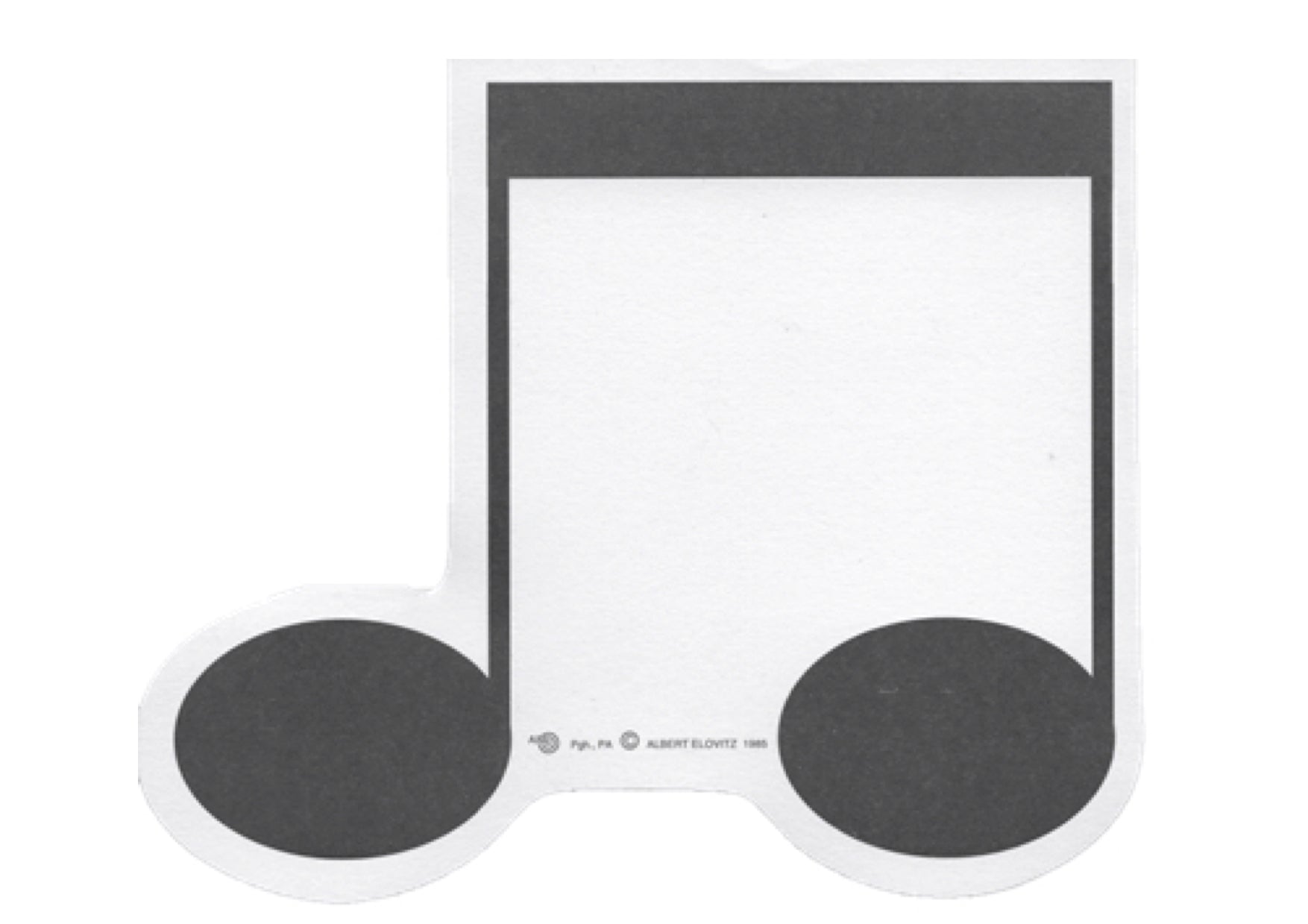 Quaver shaped novelty music themed mini notepad notebook 25pg 10cm X 8.5cm Quantity: 25pgs Dimensions: 10cm X 8.5cm A quality Albert Elovitz, Inc branded item. USA Made
