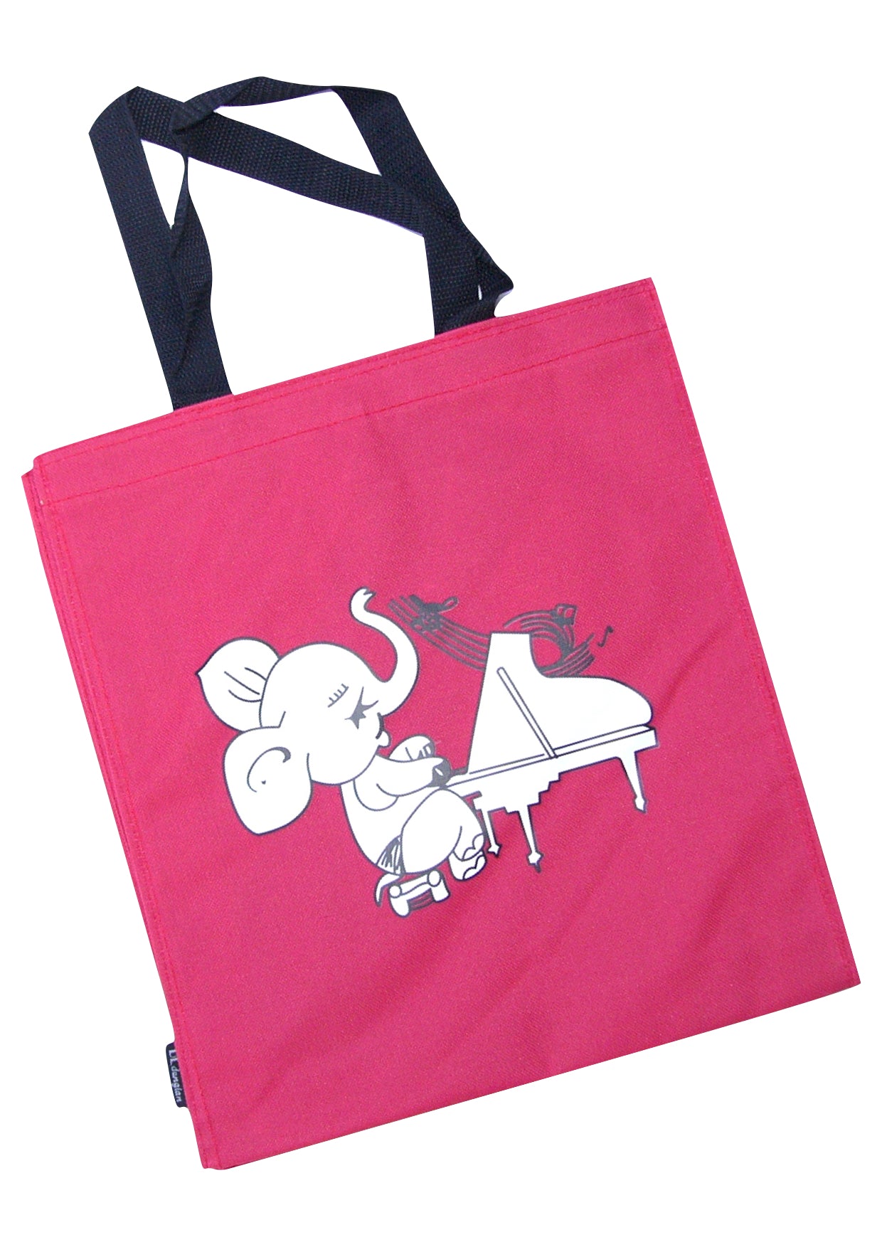 Red canvas music/library bag with elephant playing the piano Print.