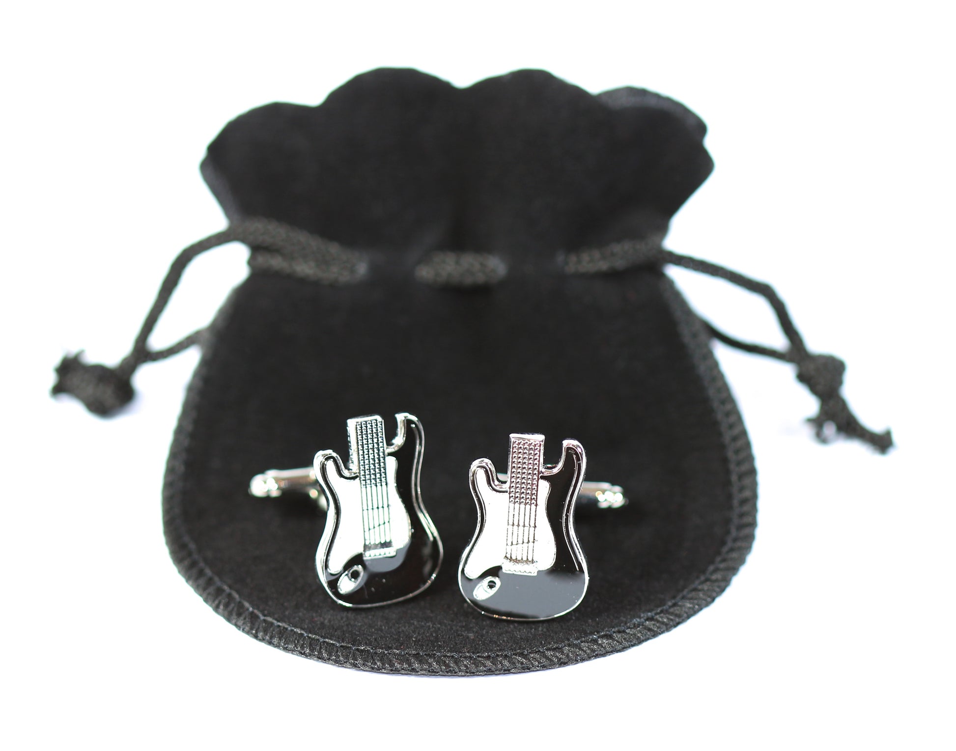 Set of 2 metal swivel bar electric guitar cufflinks in black velour gift pouch