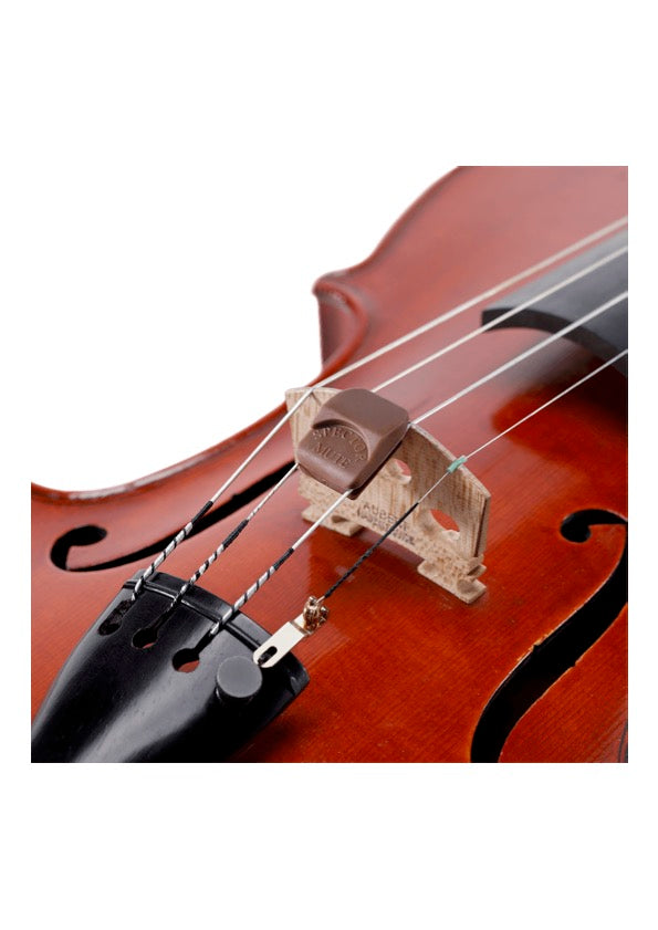 Made from a soft rubber compound, the sound quality produced from this mute is unlike other rubber or wooden mutes. Attach the mute between the D and A strings behind violin bridge. To use, gently slide mute towards bridge until mutes lip sits over bridge. When no longer needed, slide back off bridge towards tail. Mute will not slide around or rattle and vibrate. Sliding mute on and off will not grind against strings and cause them to wear down. Made in the USA by D’Addario & Company Inc.