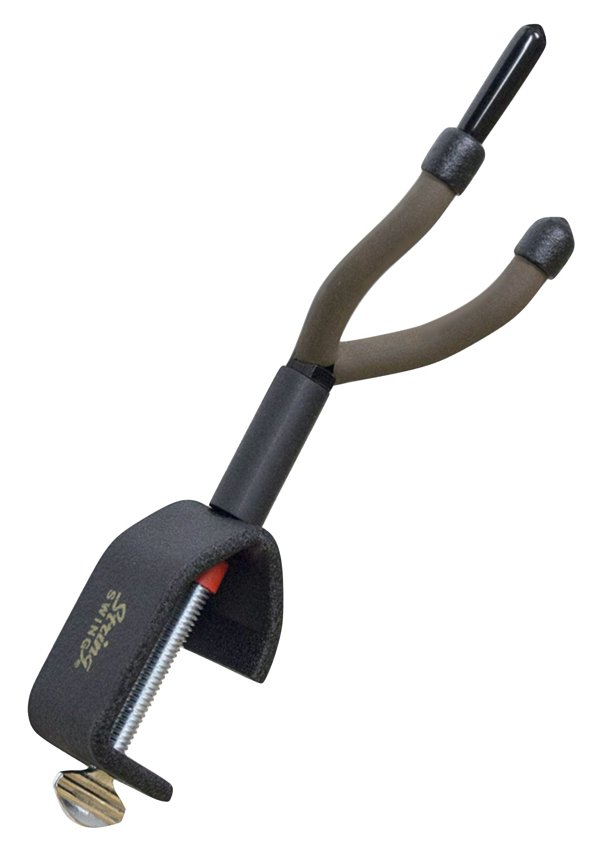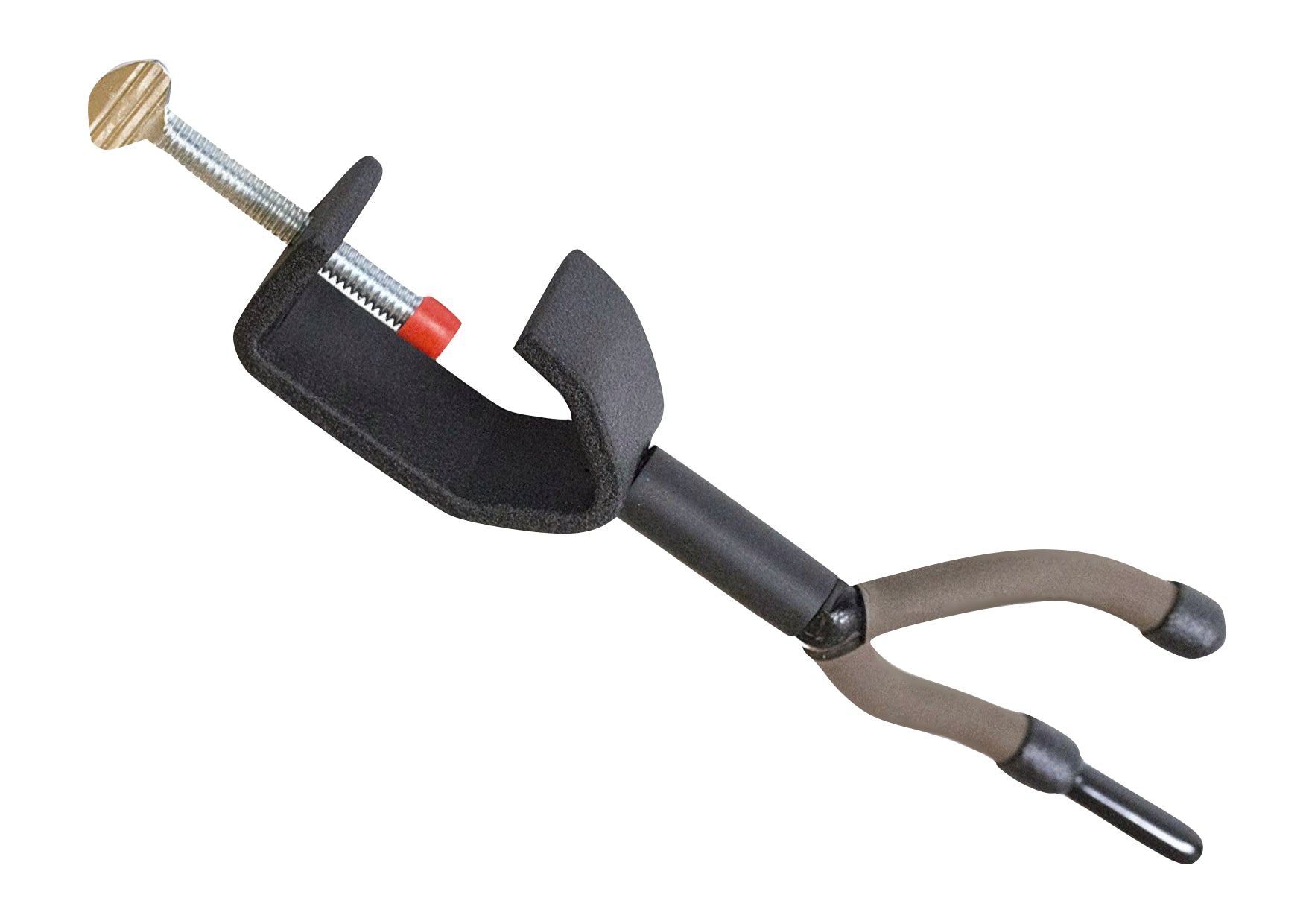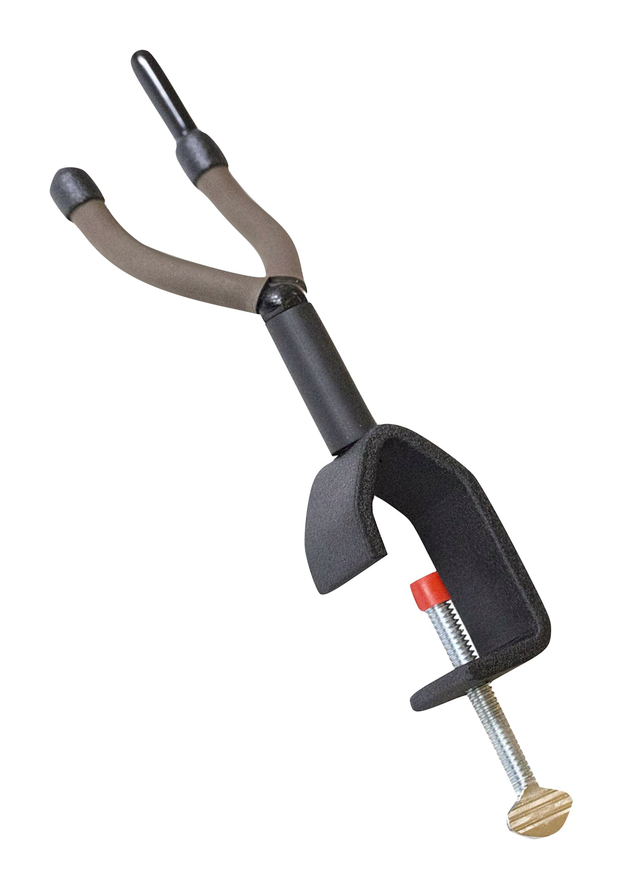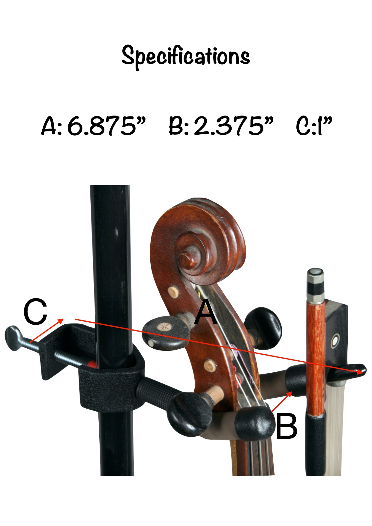 Heavy duty bracket screws securely on to music or microphone stand. The soft rubber tubing covering yoke will not harm or damage instrument. Violin pegs do not come into contact with yoke so will not affect tuning. The thumb screw clamp can be fastened to most stands (Top or bottom half) up to 1” in diameter Bow holder included Fits all violin sizes Made in the USA