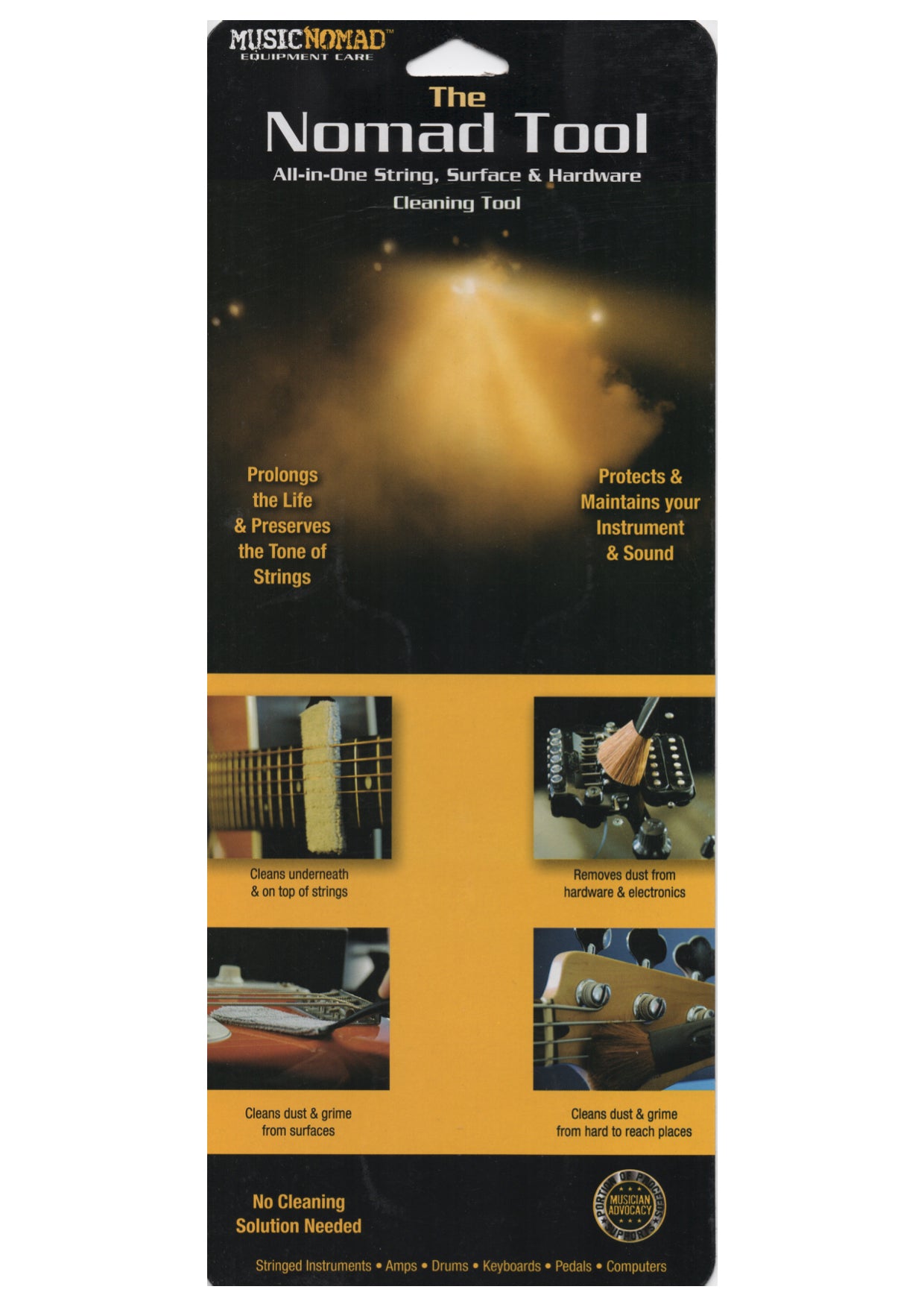 The Nomad Tool is an All-in-One multi purpose instrument string, surface, hardware and components cleaning tool/brush.