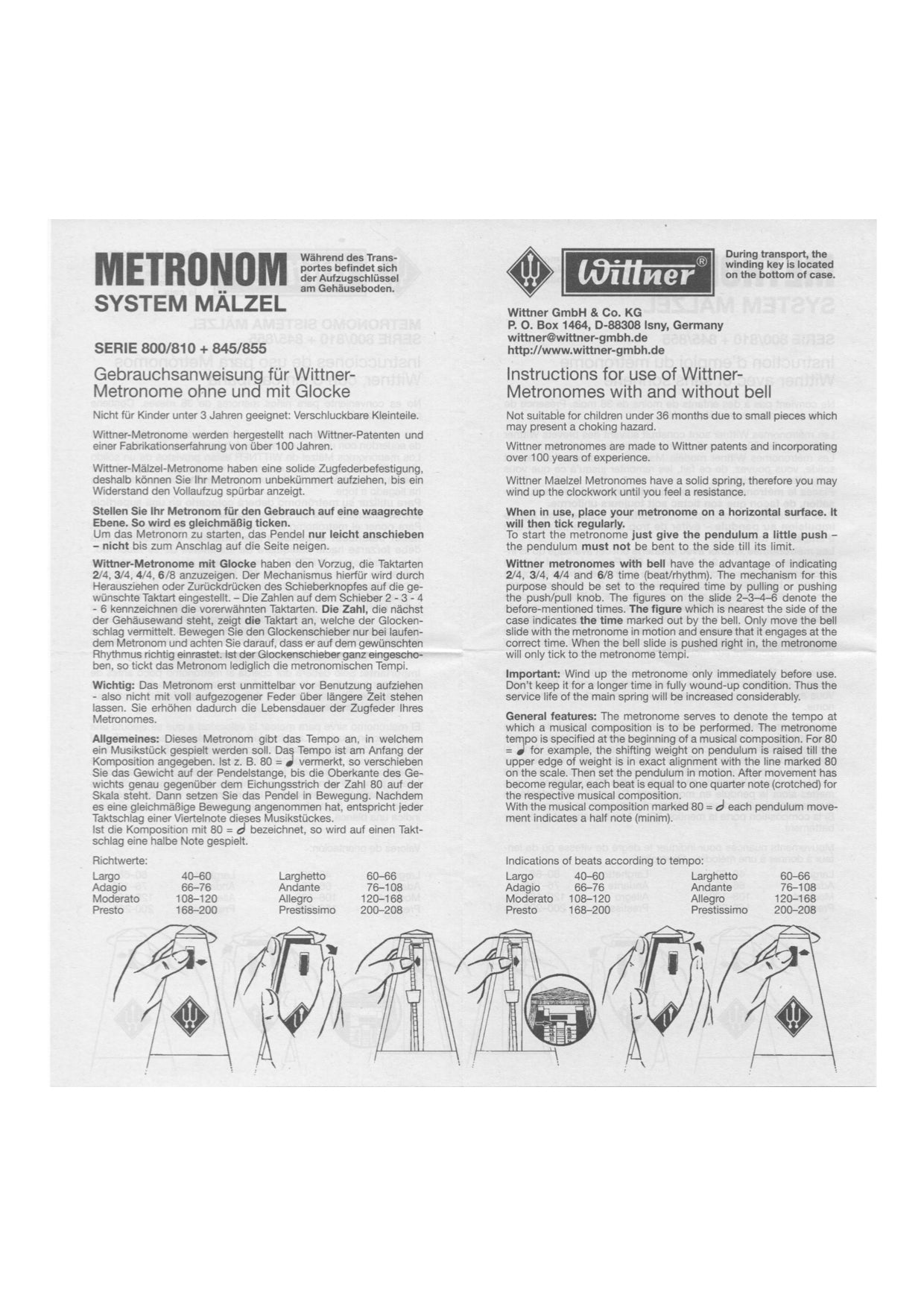 Mahogany wood grain coloured plastic shell displays beautifully atop any shelf, mantelpiece or piano. It stands at 21cm tall, 11.5cm wide at the bottom tapering to approximately 3.5cm wide at the top. It runs long and reliably (Needs to be resting on a flat surface) and marks the time both visually and audibly. The metronome is wound up by a side key which may be left sitting on the side of the unit or stored on the bottom plate of the metronome in a specially designed hole/holder. No batteries required. Transparent plastic lid pulls off when in use and easily snaps back and held securely for storage. Tempo range is between 40bpm - 208bpm with the following tempi printed on the front face for easy reference: Largo 40-60 Larghetto 60-66 Adagio 66-76 Andante 76-108 Moderato 108-120 Allegro 120-168 Presto 168-200 Prestissimo 200-208 Made in GERMANY